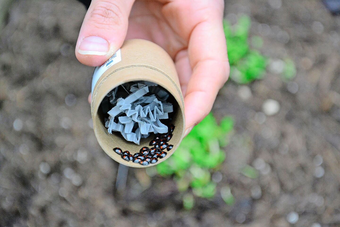 Im Abendlicht des kühlen Frühlingstages zeigen sich die freigelassenen Käfer wenig bewegungsfreudig. Das ist auch gut so, schliesslich sollen sie die Anlage nicht gleich wieder verlassen – daher die Wahl des Zeitpunkts der Freilassung. Auch Schwebfliegen könnten von den frühlingshaften Blühkisten angelockt werden, ergänzen Helena Römer und Franco Weibel. Diese sind wie ein Hochbeet aufgebaut und enthalten eine Auswahl aus 16 heimischen Arten, die Pollen und Nektar als Nahrung sowie Deckung bieten.