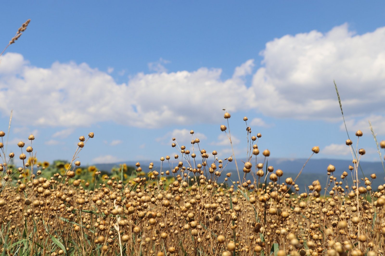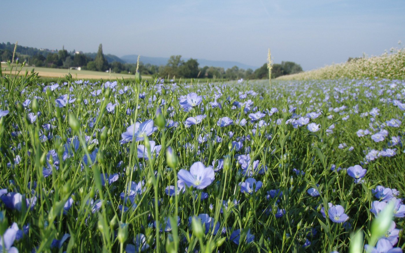 In der Blühphase dürfen die Produzenten und Passanten sich am blauen Feld erfreuen. Der Lein bildet nach dem Abblühen Kapseln, die im August respektive in frühen Jahren bereits im Juli erntereif sind.