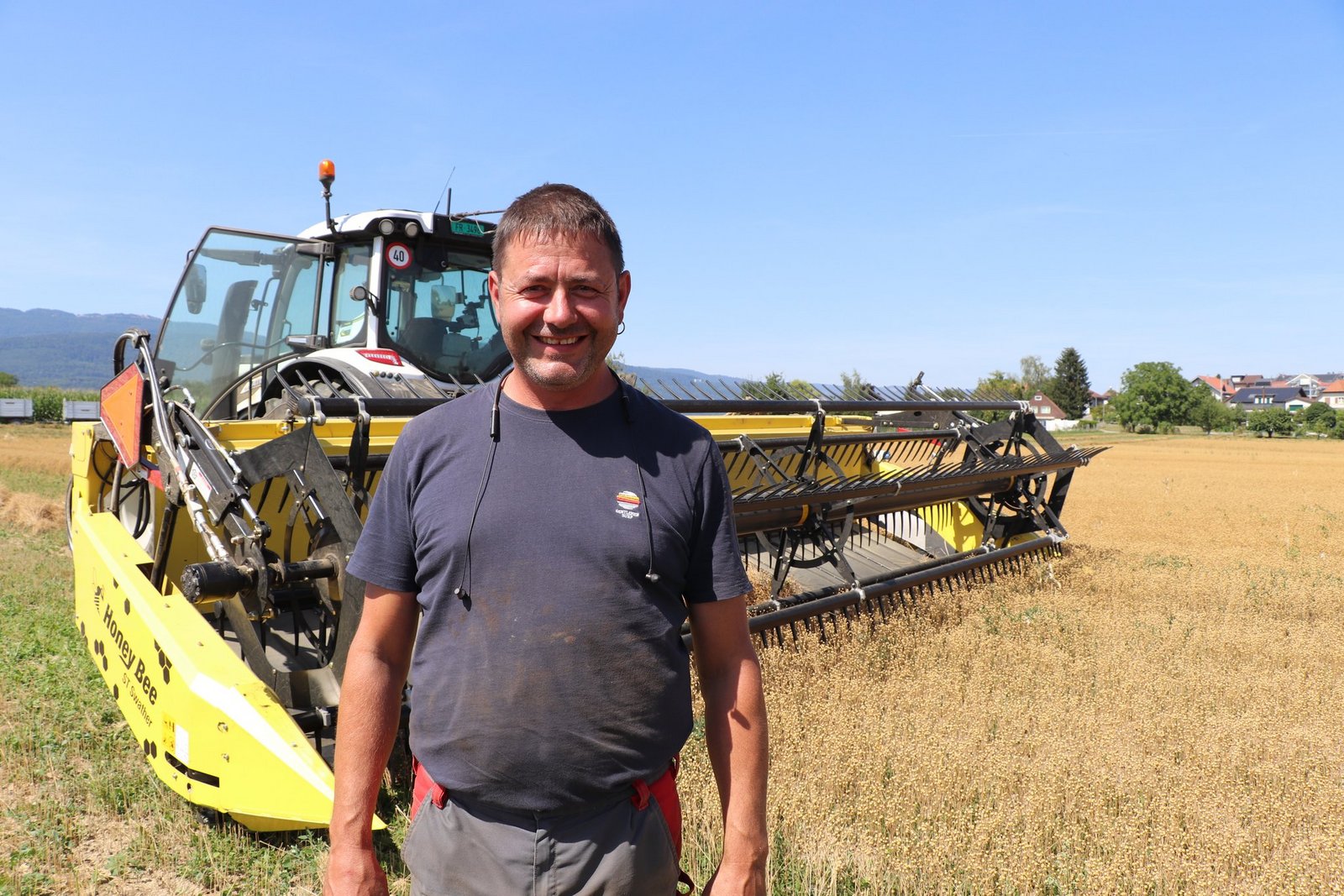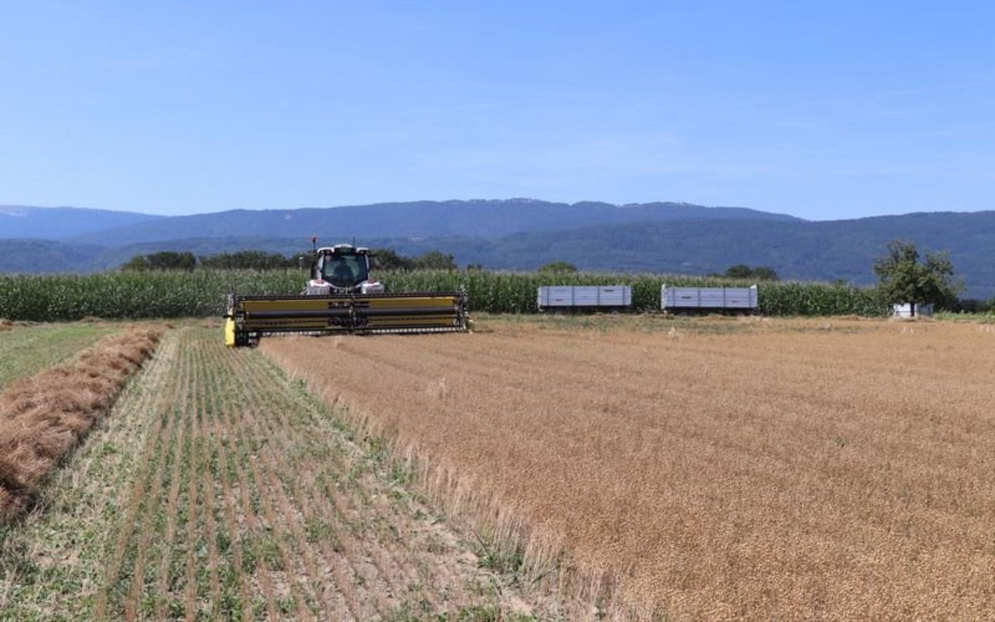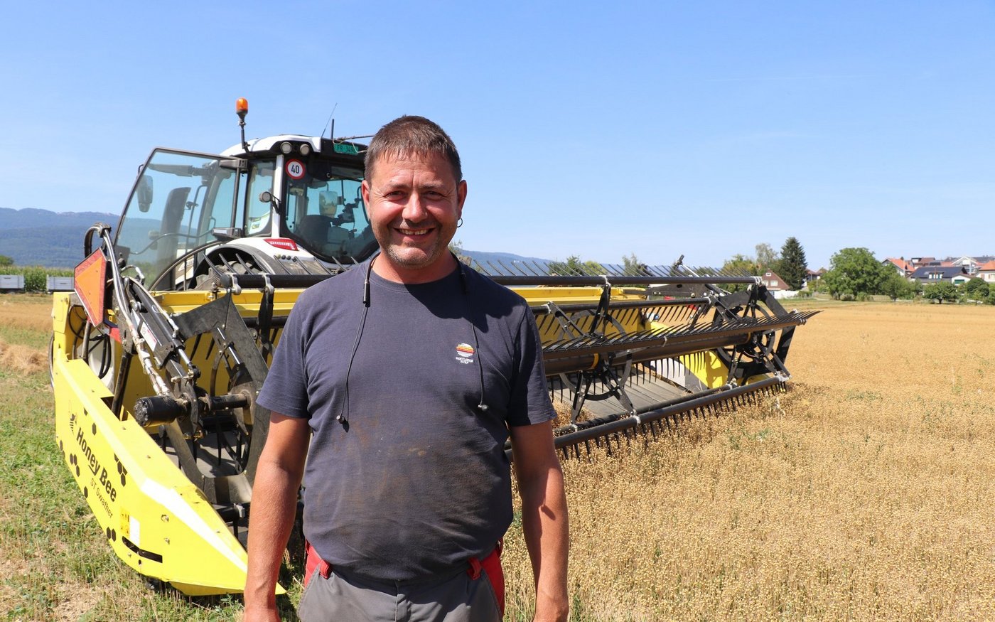 Obst- und Ackerbauer Jörg Weber aus Gerolfingen (BE), der auf knapp 2 ha Lein anbaut, ist begeistert von der Technik. Gleich auf den ersten Blick stellte er fest, dass die Verluste geringer sind. Es liegen weniger abgeschlagene Kapseln am Boden. Grüne Beikräuter trocknen bei sonnigem Wetter schneller weg. Je nach Wetterlage kann nach einem bis drei Tagen die Kultur aus dem Schwad gedroschen werden.