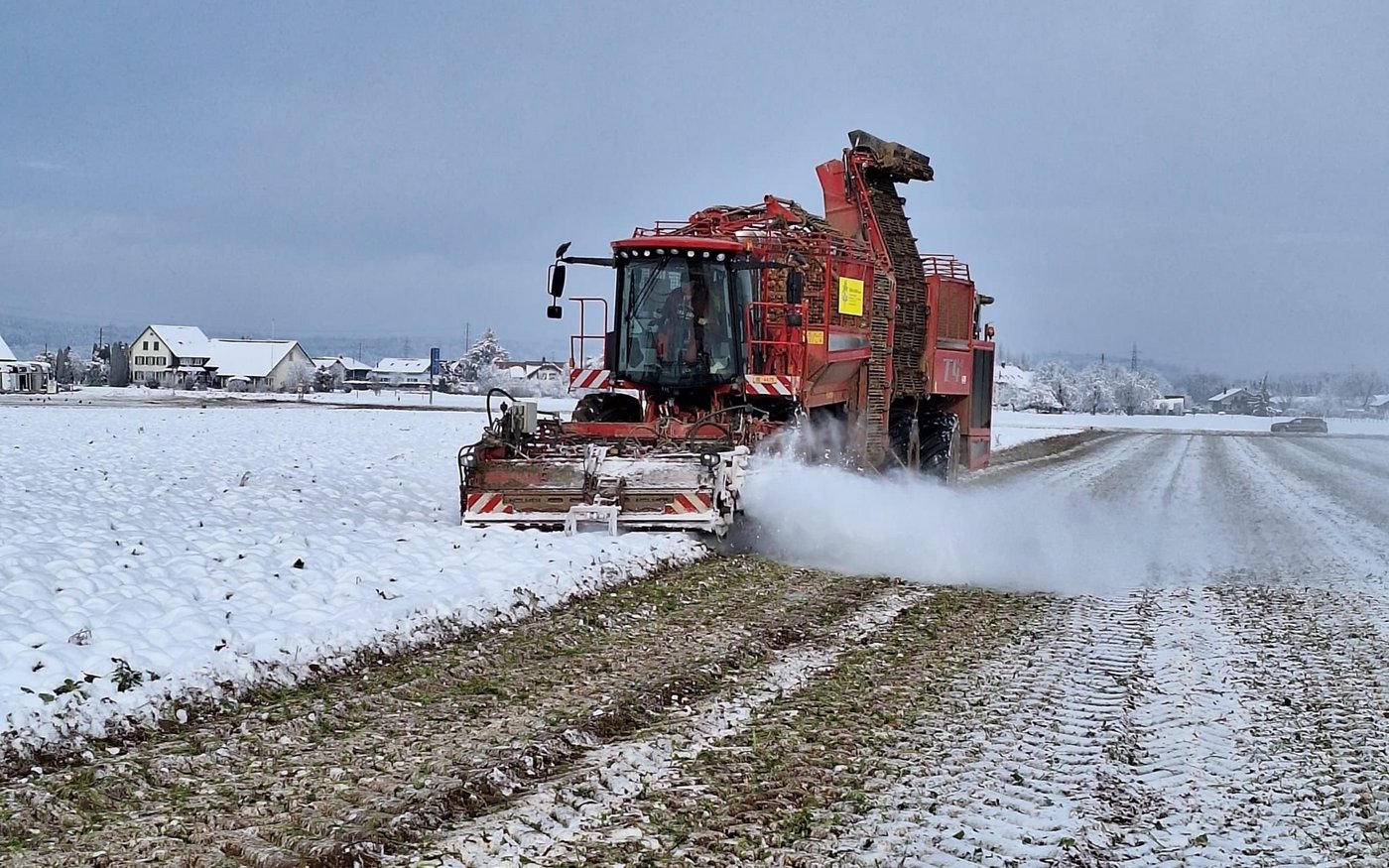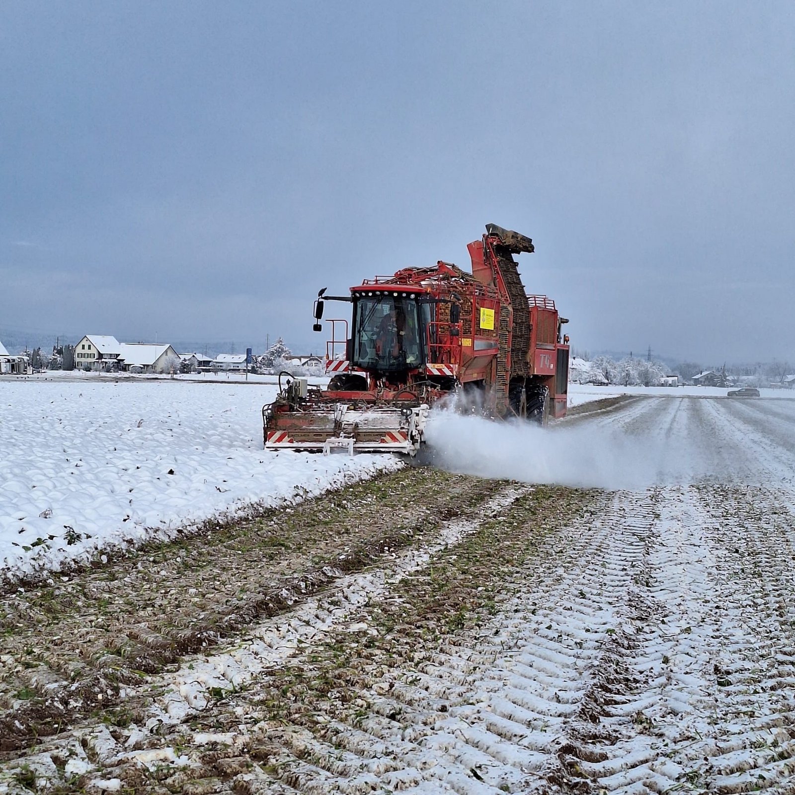 «Wir haben heute morgen um 5 Uhr mit dem Roden begonnen – das geht auch trotz des Schnees den Umständen entsprechend gut». Das rapportiert Ueli Brauen, der Geschäftsführer der Rüben GmbH aus dem Bernischen Suberg – gerade auf dem Weg zum nächsten Rübenfeld, das heute noch gerodet wird.