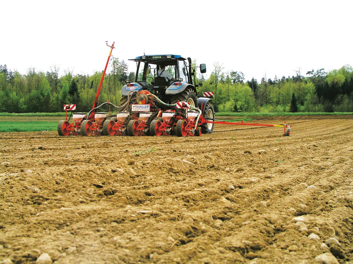 Zu guter Letzt muss der Rück-verfestigung Beachtung geschenkt werden. Das Maissaat-korn benötigt eine gute krümelige Struktur und einen gleichmässigen Saathorizont mit Anschluss an die Kapillaren mit Bodenwasser. Dafür muss der Unterboden ausreichend rückverfestigt werden. Laut Hanspeter Hug ist dies zu erreichen, wenn mit der Einzelkornsämaschine in einer gemässigten Geschwindigkeit über den Boden gefahren wird. «Je schneller man fährt, desto unregelmässiger wird das Korn bei der Aussaat abgelegt und je weniger drückt die Andruckrolle des Säaggregats auf den Boden», erklärt er. Wenn man den Boden bei der Ablagekontrolle nur noch schlecht von Hand wegschieben kann, sei das ein Indiz dafür, dass der Boden genug rückverfestigt wurde. Dem Auflaufen des Saatguts steht also nichts mehr im Wege.