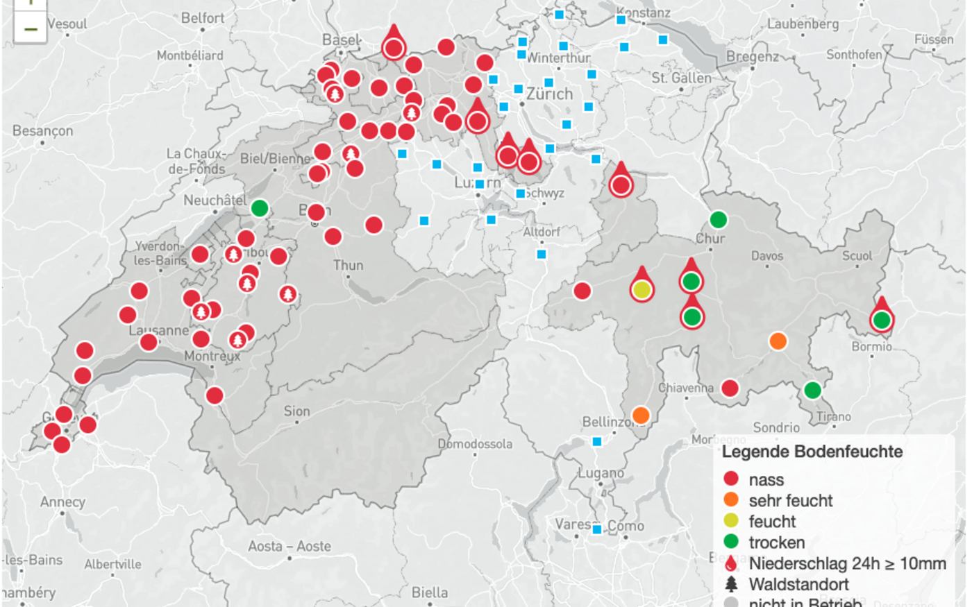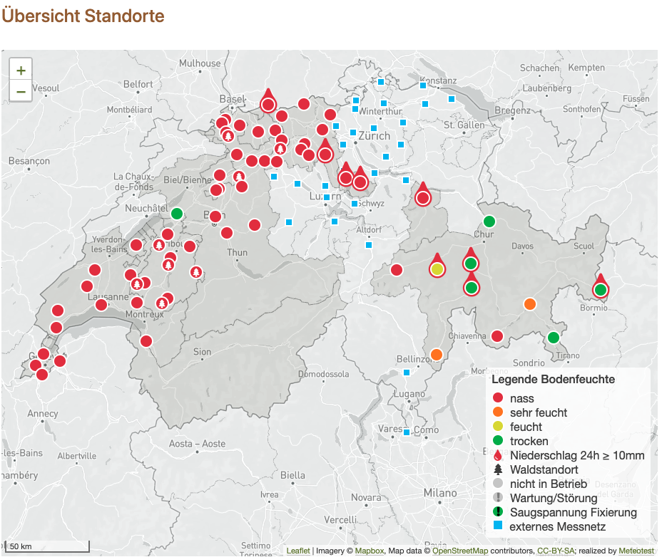 Wann kann man denn fahren? «Kein Befahren und keine Erdarbeiten wegen hohem Niederschlag.» Anfang Woche leuchtete diese Meldung dunkelrot auf dem Bodenmessnetz. Alle Messstandorte des Mittellands standen auf Rot, ausser jener in Treiten. Auf diesem eher gleyigen und skelettarmen Boden war ein Befahren gemäss Bodenmessnetz für alle Fahrzeuge unter Einhaltung der Nomogramm-Werte frei. Auf der Website von Terranimo kann man den Tongehalt und die Saugspannung des Bodens sowie die Radlast und den Reifendruck des Fahrzeugs eingeben. Mithilfe des sogenannten Entscheidungsdiagramms kann so die Befahrbarkeit beurteilt werden. Das Diagramm zeigt auch das Nomogramm des Drucks und das Nomogramm des Bodens an.