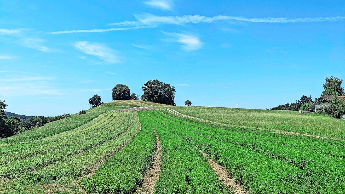 Seit 15 Jahren bewirtschaften Toni Büchler und Fabienne Emonin den 14 Hektar grossen Hof Isehuet in hügeliger Lage. Der Anbau von Kräutern, Gemüse und Obst wird ergänzt durch eine kleine Rinderhaltung und einen Hofladen mit Café. Ein Grossteil der geernteten Kräuter wird direkt auf dem Hof getrocknet, zu Tees und Gewürzen verarbeitet und u. a. an Ricola verkauft. Mitte Juni besuchte rund ein Dutzend Interessierter den Demeter-Hof in Altbüron, dies im Rahmen der Luzerner Offensive Spezialkulturen.