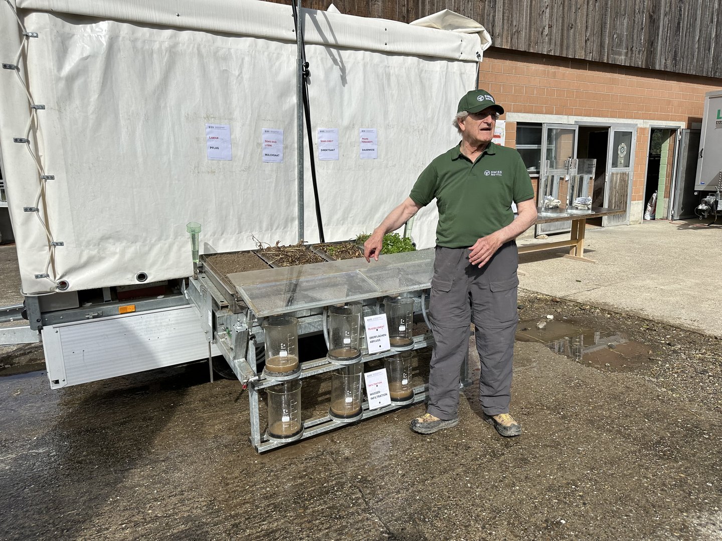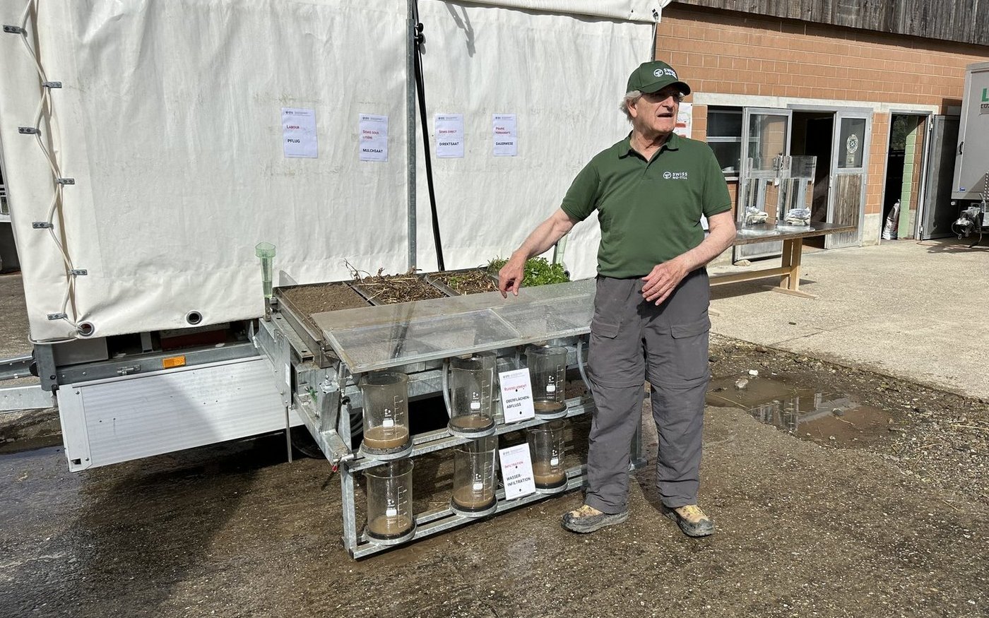 Dass die Erträge in der Schweiz trotz besseren Sorten und optimierter Düngung nicht zunehmen, führt Sturny auf «die malträtierten Böden» zurück. Dazu demonstrierte er in einem Versuch den Oberflächenabfluss und die Wasserinfiltration von Böden nach Niederschlägen bei Pflug, Mulchsaat, Direktsaat und Dauerwiese. Wenig verwunderlich schnitten die beiden Letzteren besser ab. Viele Böden seien durch das meist zu tiefe Pflügen belastet und verdichtet, die Struktur und Fruchtbarkeit vermindertm so Sturny. «Böden brauchen genügend Luft und somit Hohlräume», sagte er. Die Bodenaktivität sei in den ersten zwei Zentimetern am intensivsten.