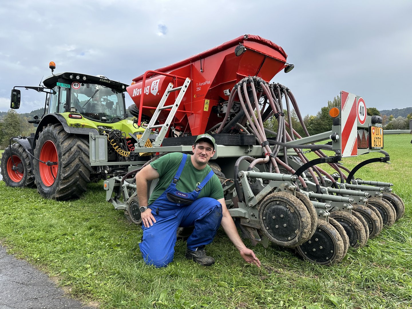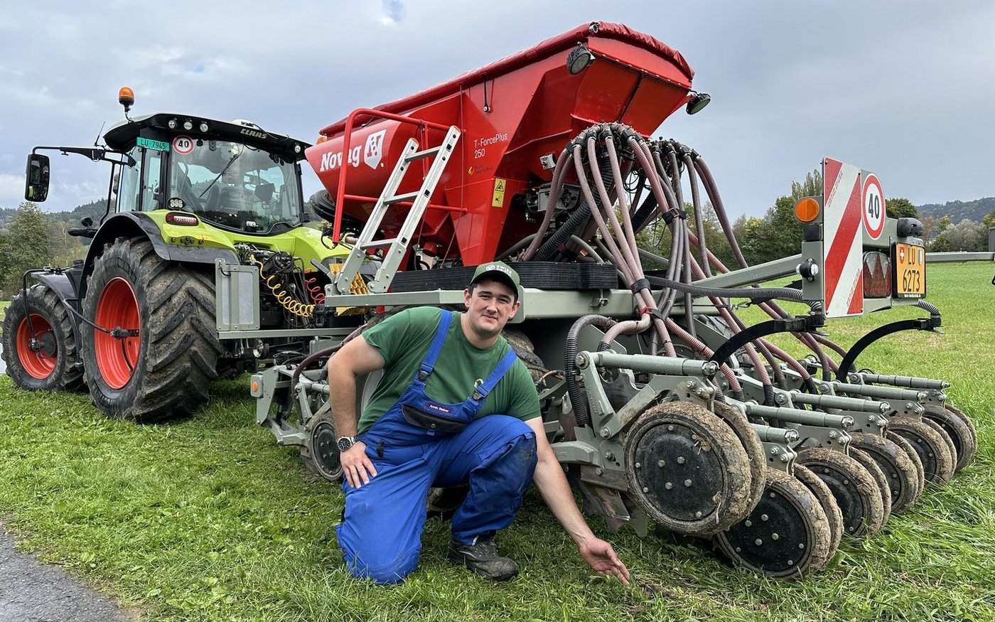 Für die Direktsaaten setzte Steiner anfänglich auf Lohnunternehmer, nun hat er selber ein innovatives Gerät angeschafft: Die T-Force Plus 250 der Firma Novag. Diese Drillsaatmaschine sei für viele Kulturen sehr flexibel einsetzbar – von Mais über Getreide bis hin zu Rüben. Die Säscharen ermöglichen einen Pressdruck von bis 500 kg. Rund 6 t schwer sei die Maschine, die über 100 000 Franken kostete. Der Druck auf den Boden lässt sich aber dank einstellbarem Pneudruck sowohl beim Traktor wie bei der Sämaschine reduzieren. Mit dem Gerät ist Steiner inzwischen selber in der Region unterwegs.