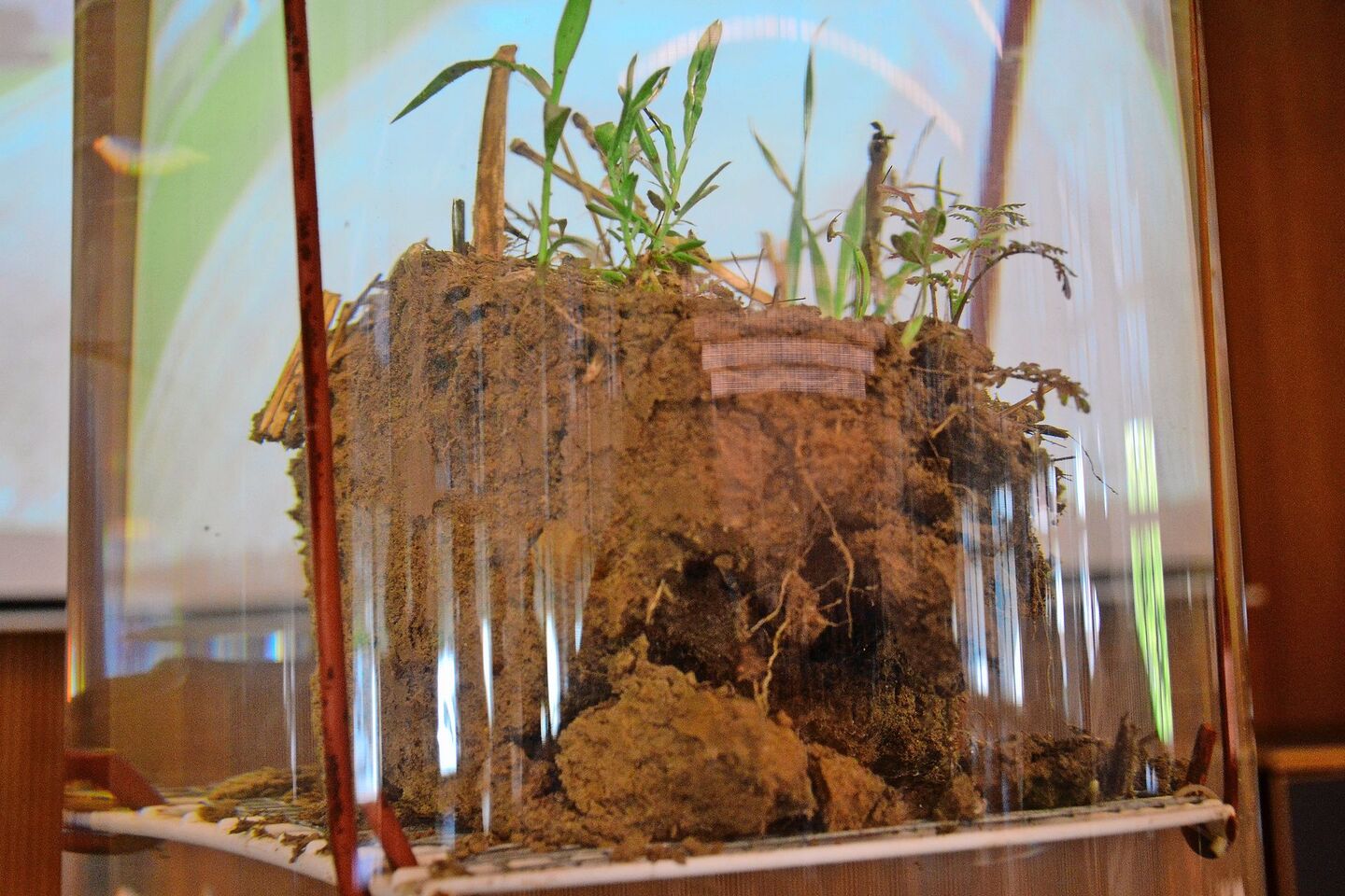 Da der Boden bei Direktsaat in der Tiefe nicht maschinell durchmischt werde, löse sich die Pflugsohle nur langsam auf. «Das meiste passiert in den obersten fünf Zentimeter», sagt Sturny. Die Unterschiede in der Krümelstabilität zeigte ein Slaketest in grossen Glaszylindern anschaulich (siehe Bilder): Während vom Klumpen aus der Pflugparzelle immer wieder Brocken abbrachen und die Erde im getrübten Wasser bereits nach kurzer Zeit kaum mehr zu sehen war, blieb die Direktsaat-Scholle deutlich sichtbar und weitgehend intakt. Nur ab und zu stiegen ein paar Luftblasen empor.