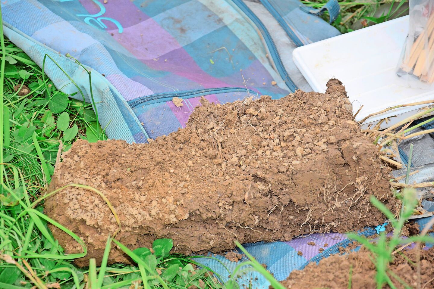 Die zweite Spatenprobe stammte von einer Fläche, auf der im Vorjahr Mais stand. Einzelne Maisstoppeln finden sich noch in der Erde und markieren die Bearbeitungstiefe. «Wenn diese Reste nach Jahren noch zu finden sind, ist das kein gutes Zeichen», kommentierte der Bodenkundler. Nach einer Maisernte bei nassen Bedingungen habe er selbst – drei Jahre später und trotz Raupendrescher – noch Stoppeln im Boden gefunden. Die Verdichtung habe den Abbau des Materials verhindert.
