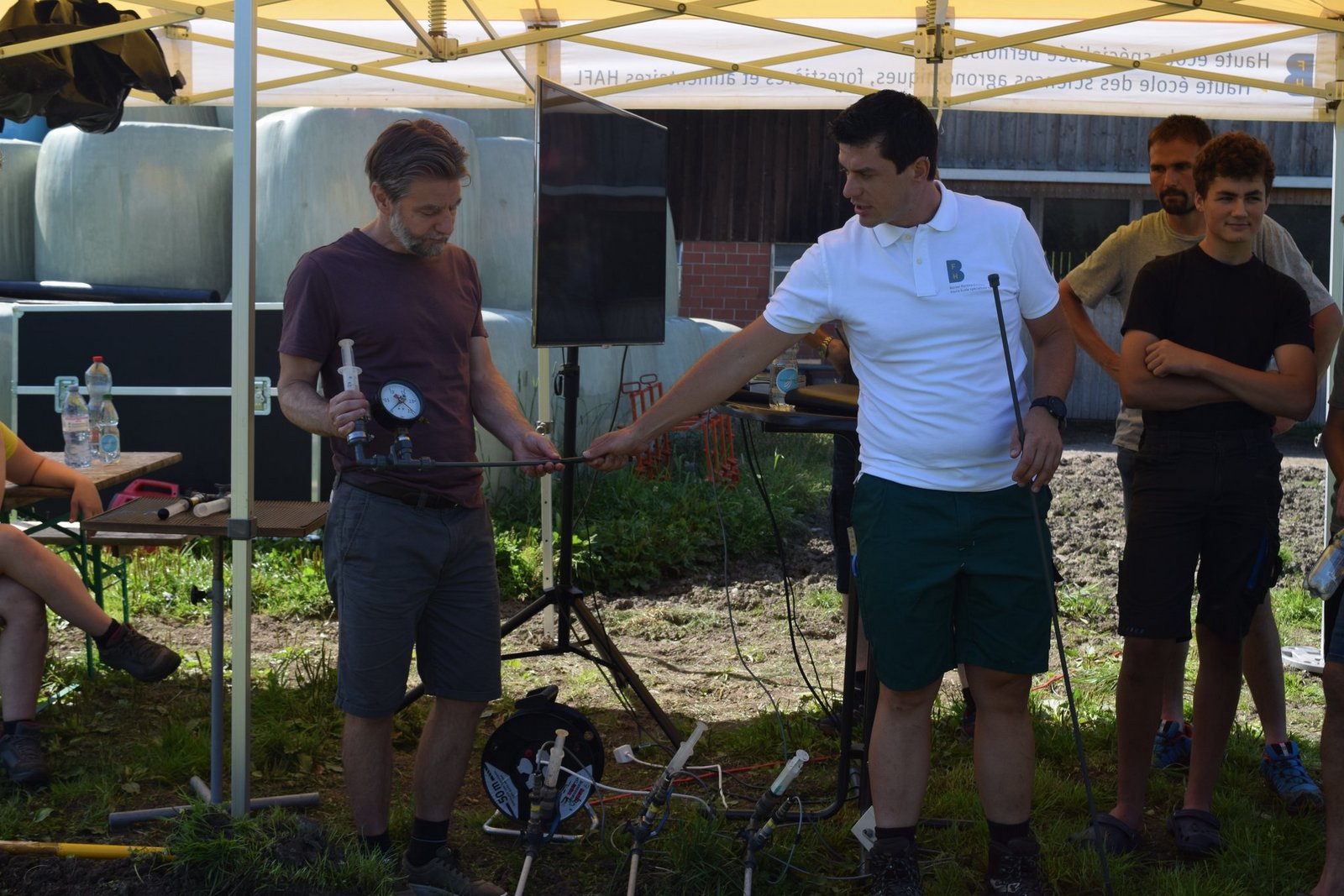 Die Bodenfestigkeit lässt sich nur bis zu einem gewissen Grad beeinflussen. Ein trockener Boden ist tragfähiger als ein nasser, ebenso erträgt ein bepflanzter Boden mehr als eine Brache. «Viel mehr beeinflussen können wir die Wahl des Geräts», sagte Stefan Gfeller, Hochschule für Agrar-, Forst- und Lebensmittelwissenschaften (HAFL). Die Teilnehmer sahen vor Ort gleich selbst, was passiert, wenn der Boden mit schweren Maschinen befahren wird. Mittels Bodendrucksensoren zeigten Keller und Gfeller, welchen Druck verschiedene Gerätschaften auf den Boden und die Feinporen ausüben.