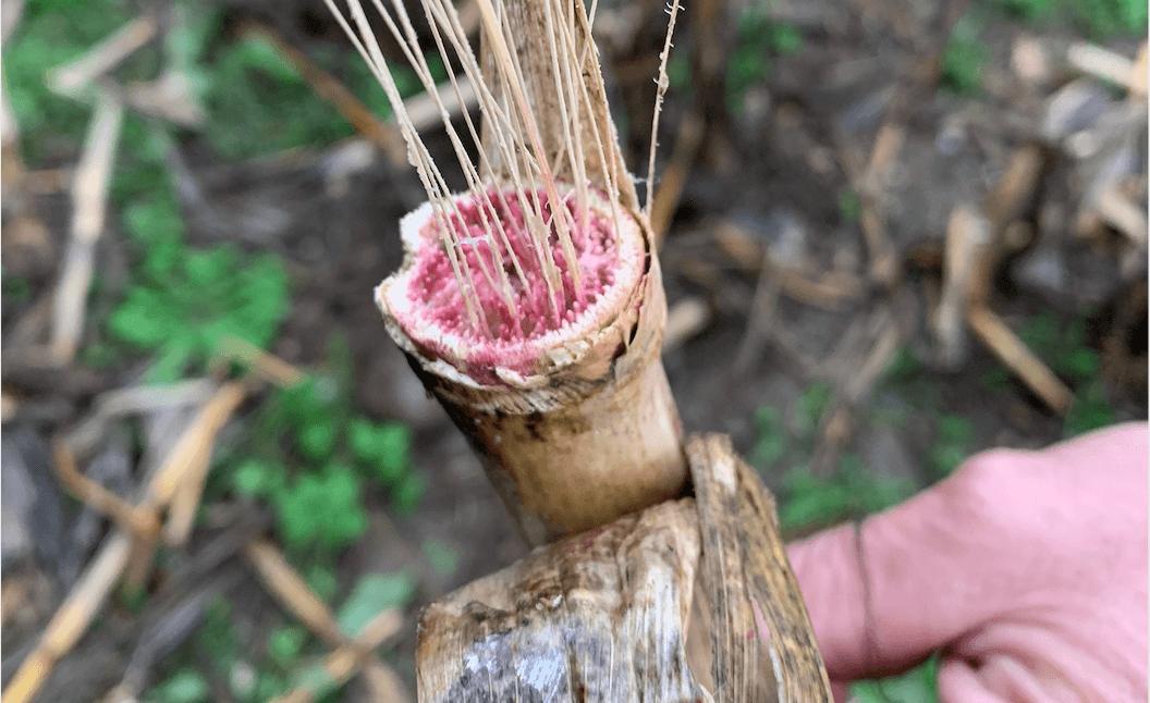 Weniger bekannt ist, dass auch eine Getreidevorkultur dem Mais Fusarien übertragen kann. Aufgrund der trocken-warmen Frühjahrswitterung dieses Jahr wurde die Fusarium-Stängelfäule gefördert. In einzelnen Parzellen, bei der noch Mais steht, sind Schäden ersichtlich. Bei Maispflanzen, bei denen vor allem die Stängelbasis befallen ist, brechen die Stängel bereits bei geringer Belastung. Abhängig vom Pilzerreger und der Maissorte ist hauptsächlich das Markgewebe in den unteren Internodien abgebaut und von weissem bis rosarotem Pilzgeflecht durchwachsen (siehe Bild) oder die Knoten weisen bräunliche Stellen auf und sind spürbar weich. Für einen weiteren Infektionsverlauf ist die Abwehr der Pflanze bestimmend, wobei Stresssituationen wie Wassermangel und Verletzungen den Befall begünstigen. Obwohl keine Fusarien an Maispflanzen ersichtlich sind, können bei Silo- und Körnermais kritische Toxinwerte erreicht werden.