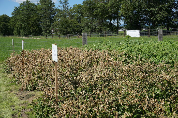 Die Blätter der Kartoffelpflanze sind braun. Doch der Stängel ist noch grün und die Staude steht nach wie vor aufrecht. Die Kartoffeln seien kräftig und richtig gut im Saft. Auch deshalb habe Natrel nicht optimal gewirkt, erklärt Simon Gasser. Er arbeitet beim Pflanzenschutzmittelhersteller Stähler. Natrel ist ein natürliches Herbizid aus ihrem Labor, das ab diesem Jahr im Verkauf ist. Es ist unter anderem für Kartoffeln zugelassen und wird dort zur chemischen Vernichtung der Stauden eingesetzt.