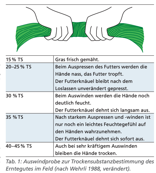 René Bünter: «Es stehen sich zusätzliche Aufwendungen, z. B. Arbeits- und Maschinenkosten, und die Futterqualität gegenüber. Futterverluste steigen mit zunehmen Durchgängen. Wir empfehlen konsequent das eigene Futter einer sensorischen Prüfung zu unterziehen. Zeigt die Auswindprobe an mehreren Stellen des Schlags einen TS-Gehalt von deutlich unter 30%, empfiehlt sich eventuell ein weiterer Arbeitsgang, je nach Wetterverlauf».