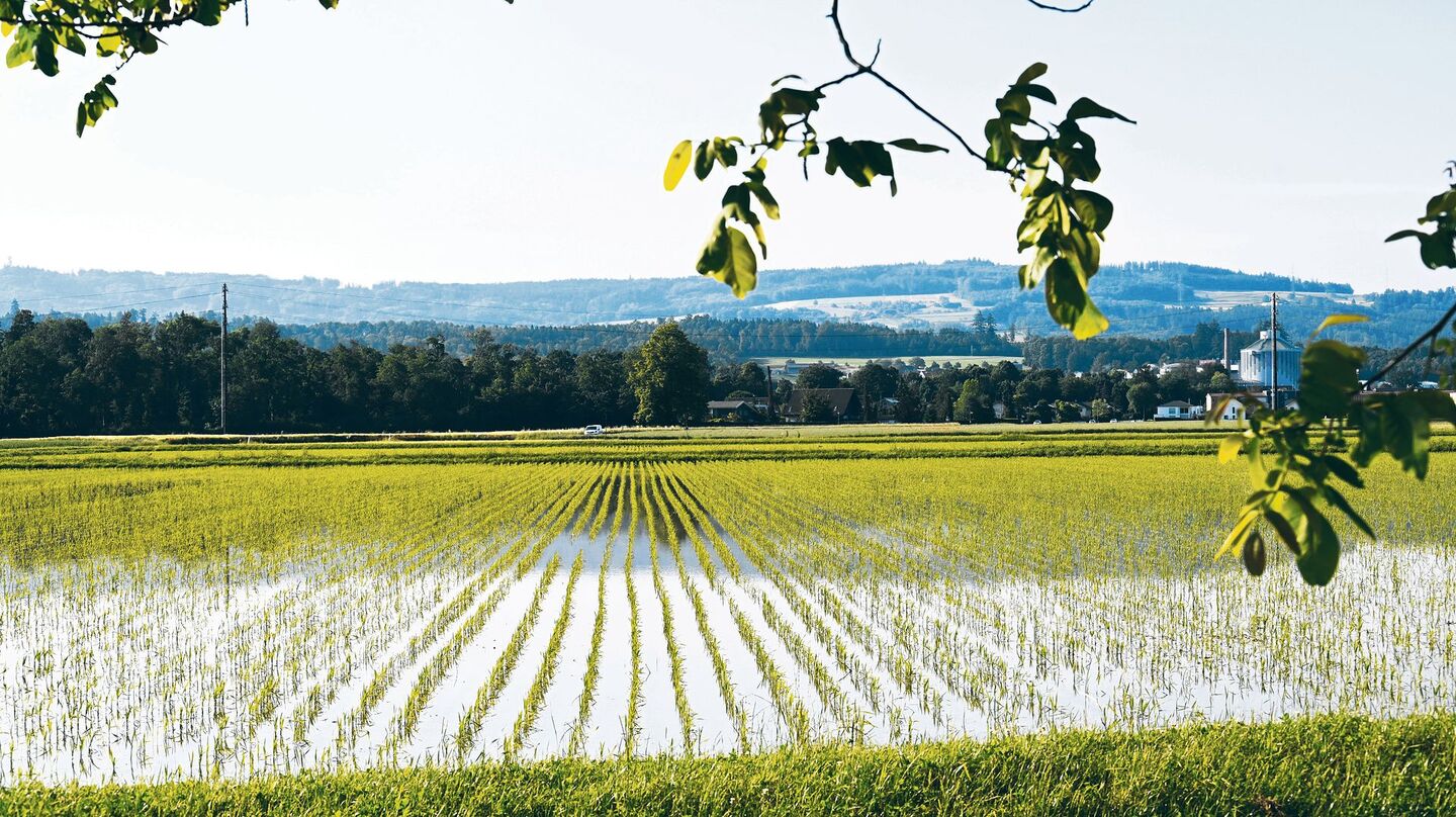 Bereits seit ein paar Jahren bauen die Gebrüder, die ansonsten Gemüse produzieren und sich auf Nüsslersalat spezialisiert haben, im Vully-Gebiet Nassreis an. Heuer kommt nun ein Grossversuch im bernischen Kappelen dazu. Im Dorf im Berner Seeland wurde im Mai ein drei Hektaren grosses Feld mit Reissetzlingen bepflanzt und geflutet. Bereits im letzten Herbst wurde das Feld dazu planiert und die Becken angelegt. «Es muss perfekt flach sein, damit ein ausgeglichenes Wasserniveau erreicht werden kann», betont der Landwirt.