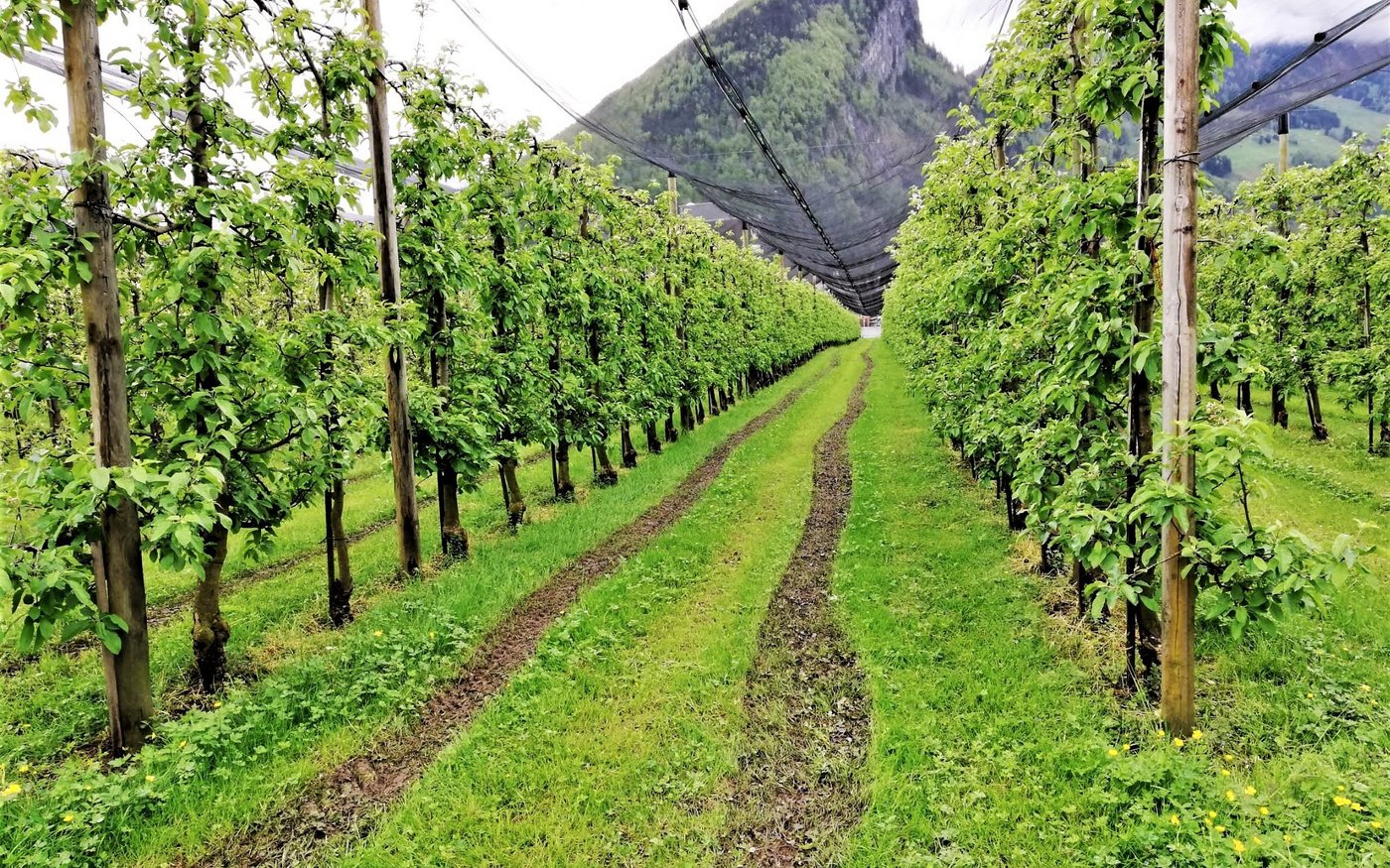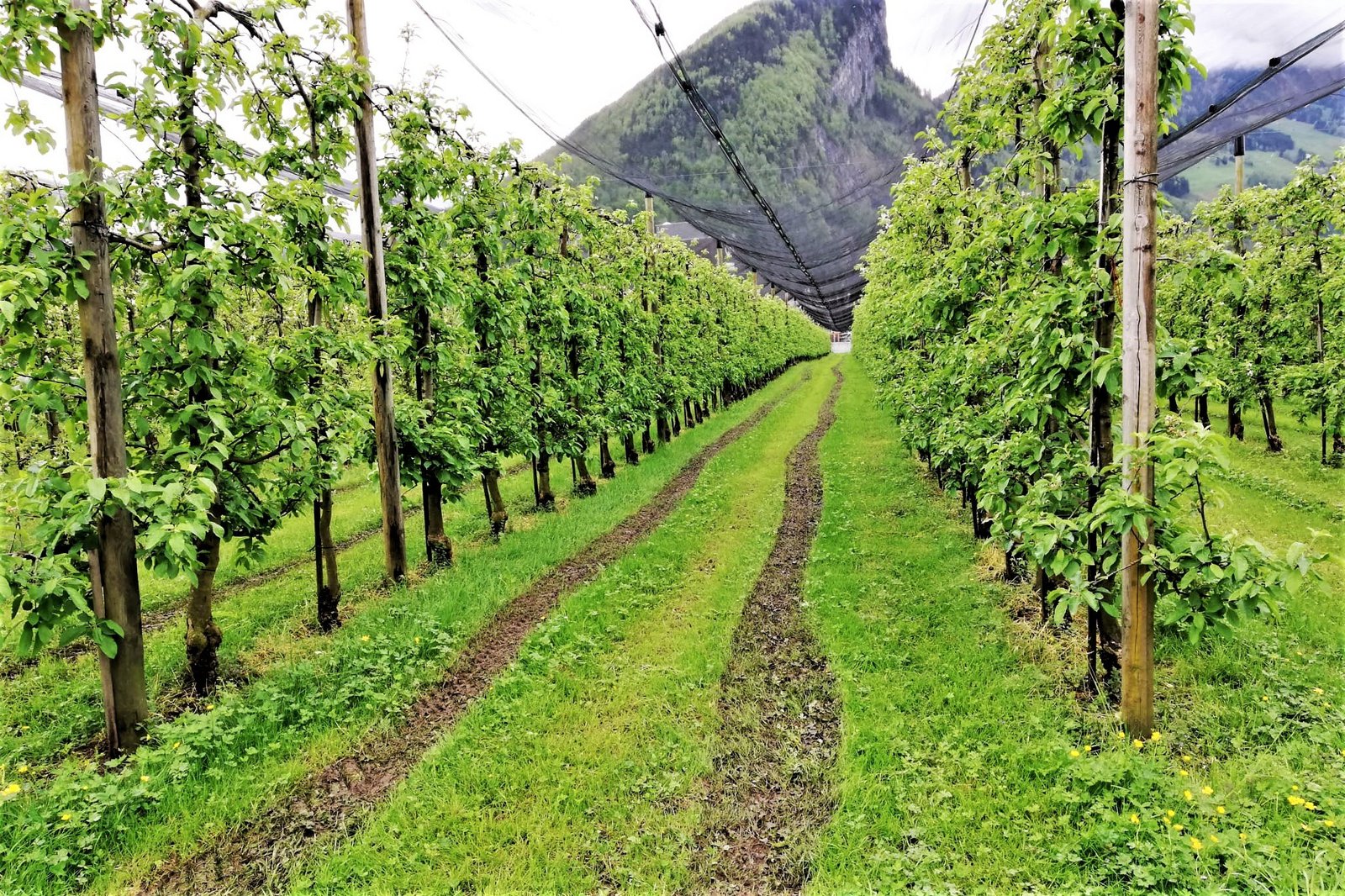 Sein geschlossenes Regendach habe sich in diesem Frühjahr noch in einem weiteren Punkt bewährt. Während mehrerer Nächte sank die Temperatur bedrohlich tief, Frostschäden bei den Blüten drohten. Dank der Unterkronenberegnung, die das Wasser gleichmässig auf Gras- und Baumstreifen verteilte, konnte während des Gefrierens Erstarrungswärme freigesetzt werden, was die Temperaturen unter dem Dach entscheidend anhob. «So konnten wir bei Aprikosen und Kirschen grössere Schäden verhindern», so Diethelm. Am prekärsten sei die Situation aktuell in den Apfelanlagen. «Da in den letzten Wochen infolge der lang anhaltenden Feuchtigkeit eine sehr hohe Schorfinfektionsgefahr bestand, waren trotz Nässe mehrere gezielte Pflanzenschutzbehandlungen unabdingbar.» Gerade in Anlagen mit schmalen Fahrgassen, wo immer in den gleichen Spuren gefahren werden müsse, habe das zu ganz unschönen Bildern geführt. [IMG 2]