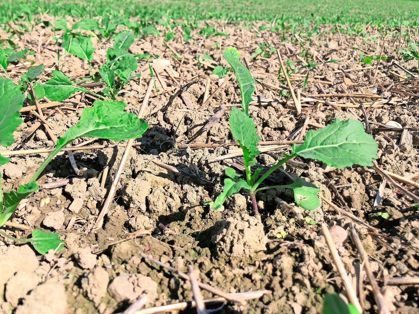 Blattdünger sind in der Ausbringung pro Einheit Nährstoff recht teuer und werden möglichst mit Pflanzenschutzbehandlungen kombiniert eingesetzt. Die Produkte lassen sich in der Regel vielseitig mischen (was allerdings vorgängig abgeklärt werden muss). Anders sieht es je nachdem mit Stärkungsmitteln auf Basis von Mikroorganismen aus. Dafür ist im Fall von Bakterien oder zum Beispiel Komposttee die Blattmasse der Kultur zweitrangig: «Beides tut auch dem Boden gut», so René Hartmann. Für Blattdünger mit Nährstoffen oder Spurenelementen empfiehlt er hingegen, mindestens bis zum vierten echten Blatt an der Rapspflanze zu warten.