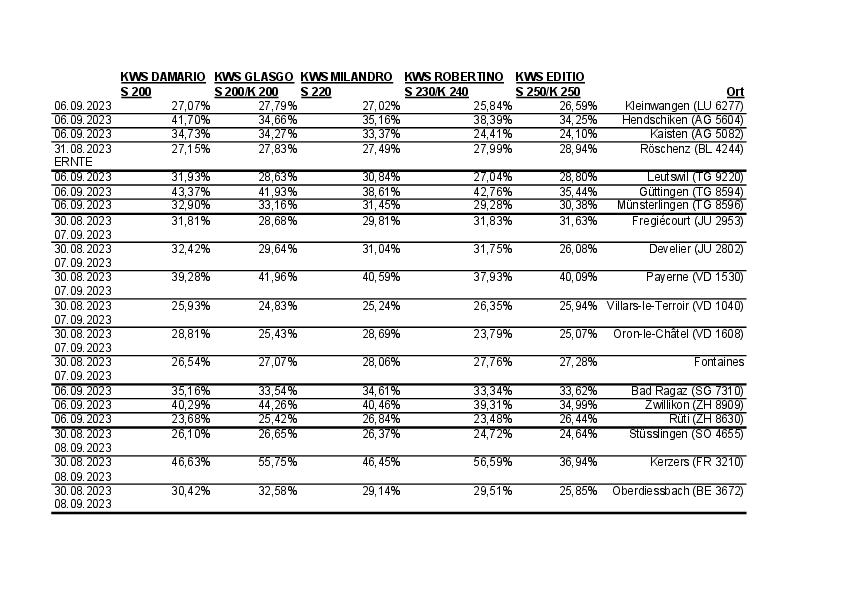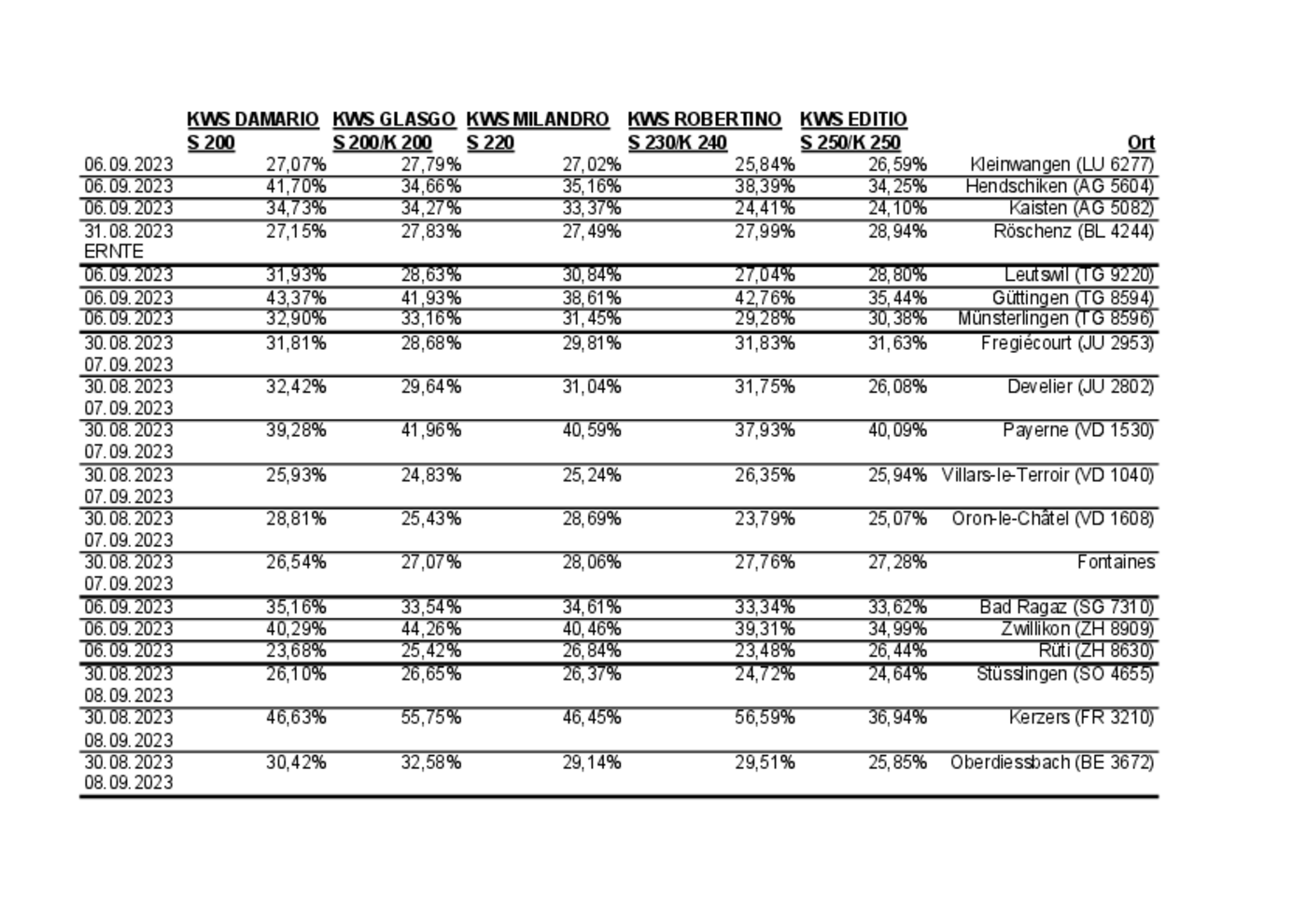 Die ausgewählten Sorten sind ein Querschnitt der in der Schweiz angebauten Durchschnittssorten. Der Messbeginn ist an allen Standorten jeweils bei der Ernte des frühesten Standortes. Aktuelle Beprobungen zeigen, dass gerade frühe Sorten an einigen Standorten bereits sehr fortgeschritten sind. So weist zum Beispiel in Kerzers FR die Sorte KWS Glasgo bereits eine TS von 55,75 % auf, in Rüti ZH hat dieselbe Sorte jedoch erst 25,42 %. Die Daten vom am 06.09.2023 durchgeführten Maismonitoring sind in der unten stehenden Tabelle aufgeführt.