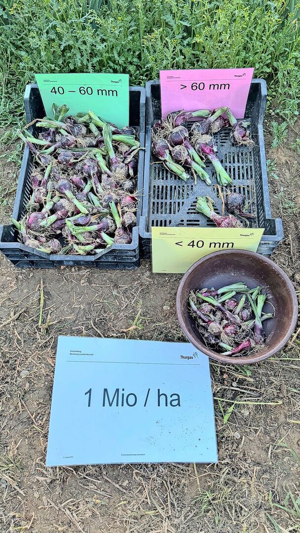 Die Zwiebeln wurden bei 1 Million, 1,25 Millionen und 1,5 Millionen pro Hektare ausgesät. «Unser Ziel war es, herauszufinden, ob mit einer erhöhten Saatstärke der Anteil marktfähiger Kaliber erhöht werden kann», kommentierte Andrea Marti das Versuchsziel. Die Hypothese sei dabei, dass dank der höheren Saatstärke weniger zu grosse Kaliber erreicht würden, sagt Marti. Die höhere Saatstärke bringe aber auch Risiken mit sich wie ein erhöhtes Krankheitsrisiko.