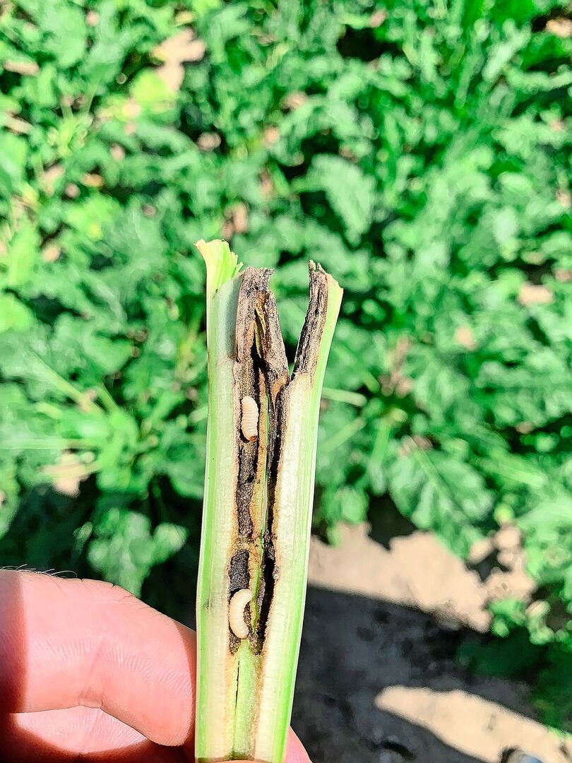 Anders als im letzten Jahr fiel bislang regelmässig Regen, wodurch die Pflanzen kaum in Stresssituationen gerieten. Das üppige Laub nährt die Larven des Rüsselkäfers gut, wodurch davon auszugehen ist, dass weniger Frassgänge im Rübenkopf entstehen als im Vorjahr. Des Weiteren wurden bereits einige Larven gefunden, welche sich verpuppt und den Stiel bereits verlassen haben. Der Zyklus neigt sich also langsam dem Ende zu und der Befall wird nicht weiter zunehmen.