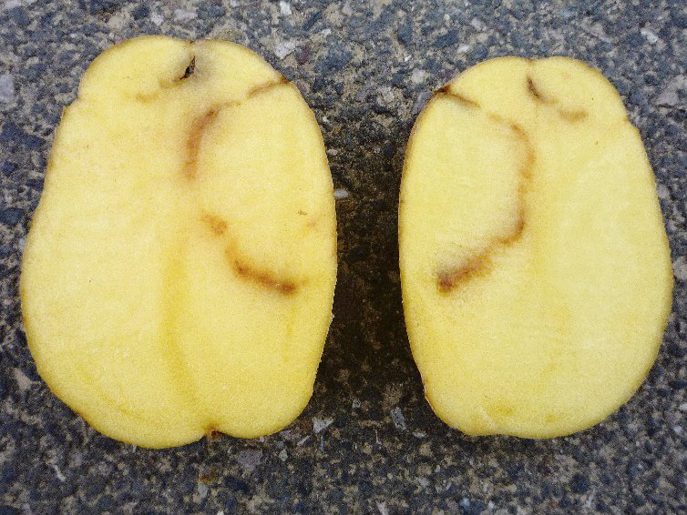 Die Symptome der Eisenfleckigkeit auf den Knollen variieren von dunklen, nekrotischen Flecken oder Linien bis hin zu Ringen (Ringnekrosen). Diese Ringe können auch tief in die Knollen gehen (Pfropfenbildung). In den Knollen zeigen sich unregelmässige braune Flecken.