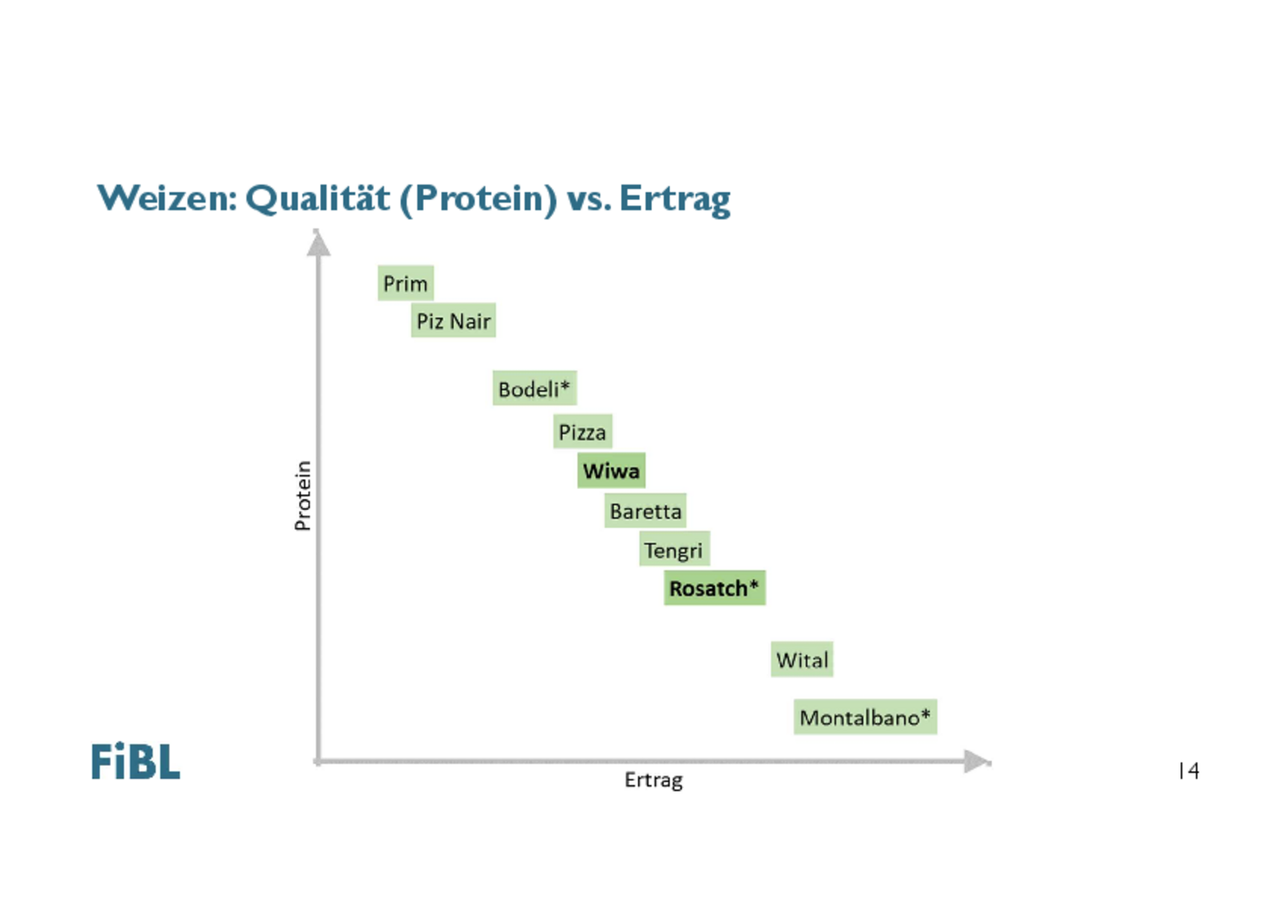 Da rund 80 % des Bioweizens industriell verarbeitet werde, sei Qualität sehr wichtig. «Qualität und Ertrag sind immer gegenläufig. Verfügt eine Sorte über einen hohen Proteingehalt, sinkt der Ertrag», erklärte Christen. Umgekehrt hätten ertragsstarke Sorten einen tiefen Proteingehalt.