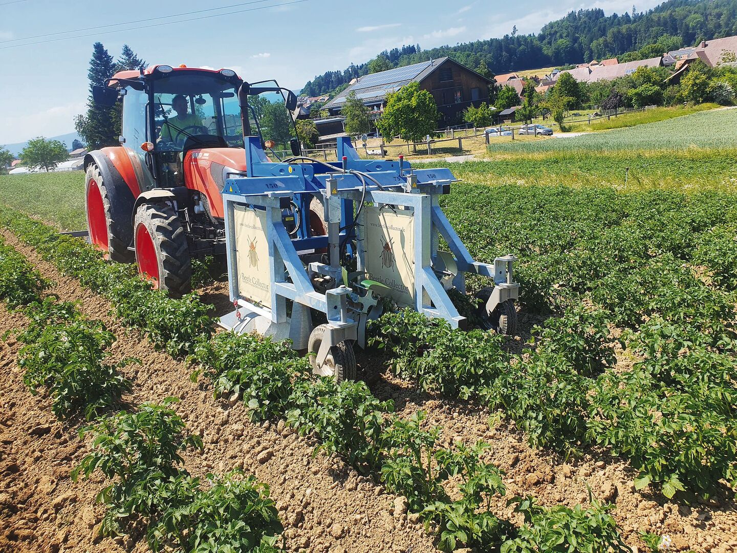 Gegen Kartoffelkäfer testete Tobias Gelencsér 2023 auf einem Kartoffelfeld von Christoph Hauert, Grossaffoltern BE, eine Maschine, die Kartoffelkäfer abschüttelt und aufsammelt.