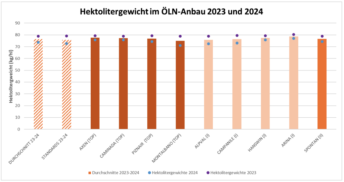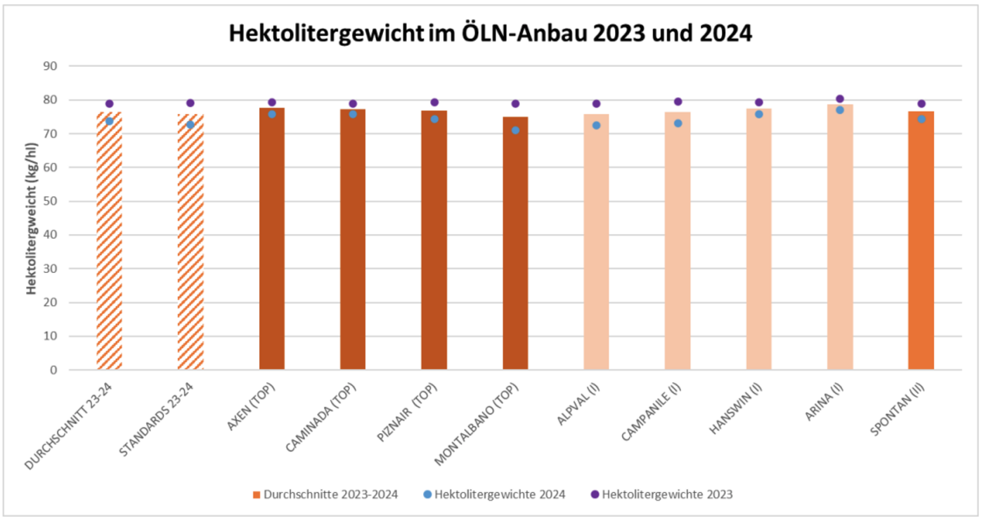 Insgesamt liegen die Erträge 2024 unter ÖLN- (60,1 dt/ha) und Extenso-Bedingungen (51,2 dt/ha) jedoch deutlich unter denen des Vorjahres. Beim Gewicht pro Hektoliter ist im Vergleich zum Vorjahr ein deutlicher Rückgang zu verzeichnen. Das durchschnittliche Gewicht pro Hektoliter beträgt im Jahr 2024 73,8 kg/hl (ÖLN) bzw. 73,2 kg/hl (Extenso). Im Vorjahr lagen die Werte bei 78,9 kg/hl (ÖLN) und 78,5 kg/hl (Extenso).