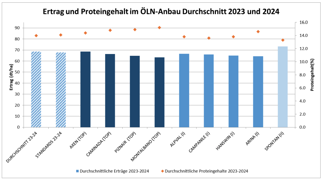 In der TOP-Klasse erzielt Axen unter ÖLN-Bedingungen den höchsten Ertrag (60,5 dt/ha), gefolgt von Caminada (58,7 dt/ha), Piznair (54 dt/ha), Montalbano (52,0 dt/ha) und Bodeli (45,8 dt/ha). Beim Proteingehalt liegt Bodeli an erster Stelle (16,9 %), gefolgt von Montalbano (16,3 %), Piznair (15,9 %), Caminada (15,8 %) und Axen (15,2 %). Das Gewicht pro Hektoliter von Axen (75,8 kg/hl) ist etwas höher als das von Caminada (75,7 kg/hl). Gefolgt von Piznair (74,4 kg/hl), Montalbano (71,1 kg/hl) und Bodeli (68,6 kg/hl).