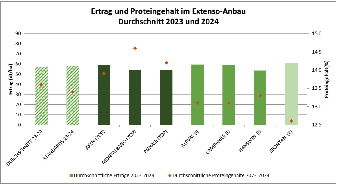 Unter Extenso-Bedingungen belegen Axen (55 dt/ha) und Caminada (54,8 dt/ha) in der TOP-Klasse die ersten beiden Plätze beim Kornertrag. Deutlich dahinter folgen Piznair (46,4 dt/ha), Montalbano (45,3 dt/ha) und Bodeli (44,5 dt/ha).