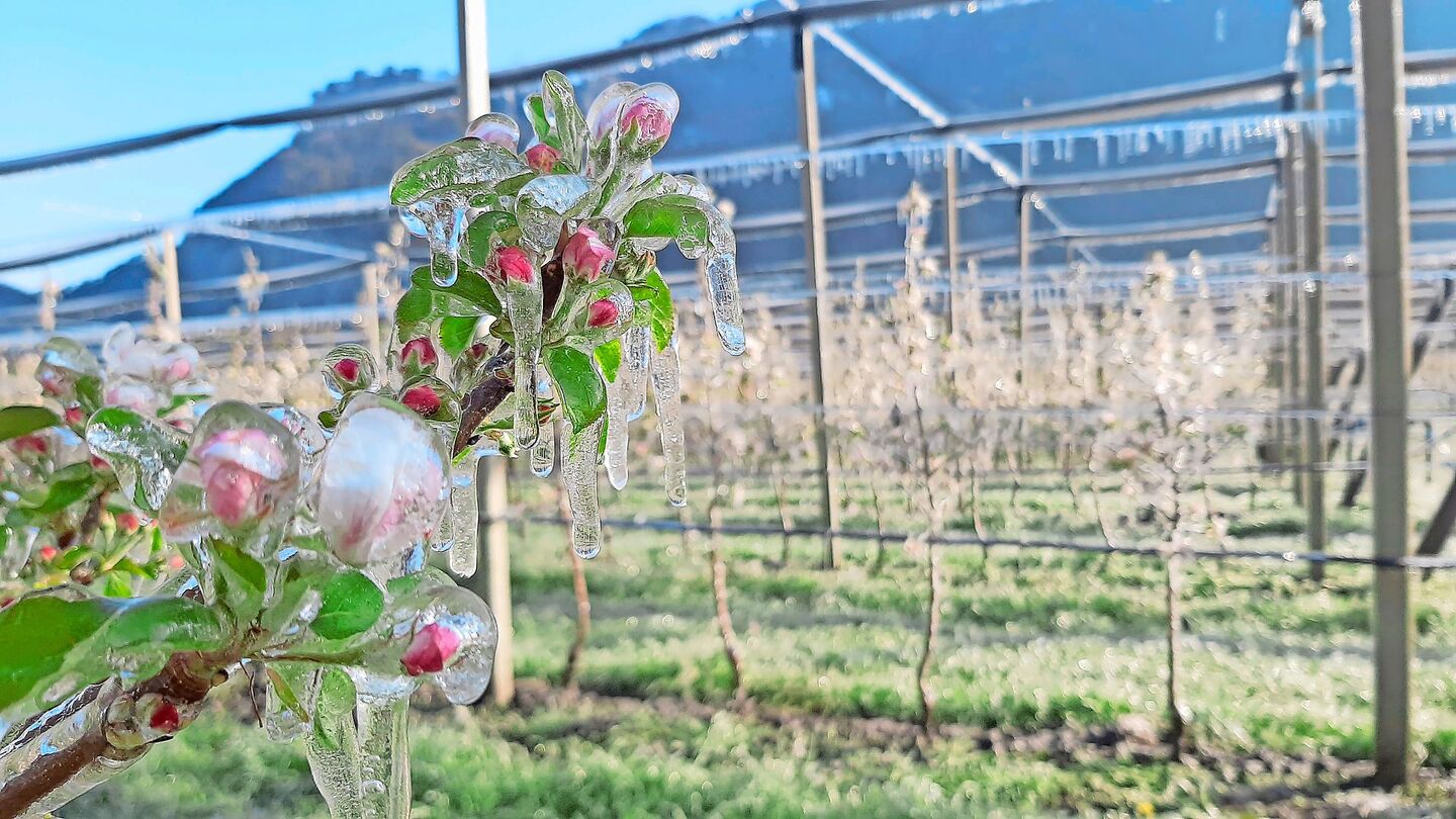 Die gesamte Obstanlage kann mit Frostberegnung vor Minustemperaturen geschützt werden. Der Niederschlag durch die Frostberegnung bildet eine Eishülle um die Apfelblüten. Bei der Bildung dieser Eisschicht wird Energie in Form von Wärme freigesetzt, die die Blüten vor den Minustemperaturen bewahrt. Zwei Wetterstationen in der Obstanlage ermöglichen eine exakte Beobachtung des Temperaturverlaufes. Nähern sich die Temperaturen dem kritischen Wert, berät die Familie gemeinsam das weitere Vorgehen. Die Frostberegnung sollte nur bei bestimmten Voraussetzungen eingeschaltet werden. Die Luftfeuchtigkeit sollte mindestens 80 Prozent betragen und es sollte windstill sein. Kalte Winde wehen die Wärmenergie davon. Pro Hektare und Stunde werden die Blüten mit 40 m³ Wasser berieselt. Einmal eingeschaltet, läuft die Beregnung bis zum ersten Sonnenstrahl.