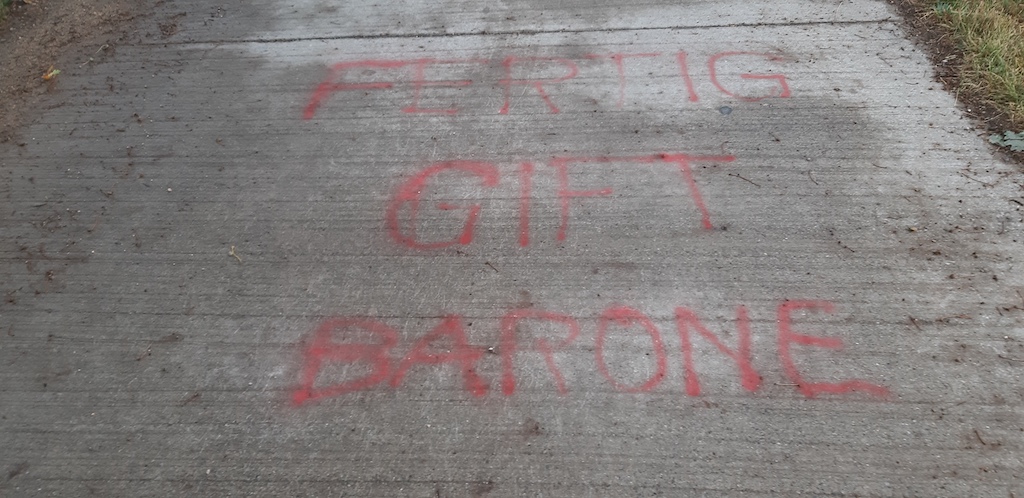 «Ich fühle mich betupft.» Landwirt Hanspeter Brunner aus Kappelen im Berner Seeland ist die emotionale Gefühlslage am Telefon deutlich anzuhören. Grund ist der gesprayte Schriftzug «Fertig Giftbarone» auf mehreren geteerten Feldwegen in der Nähe der Gemeinde Kappelen. «Wir machen doch nichts Verbotenes. Alle Mittel, die wir einsetzen, sind schliesslich vom Bund zugelassen», rechtfertigt sich der Landwirt.