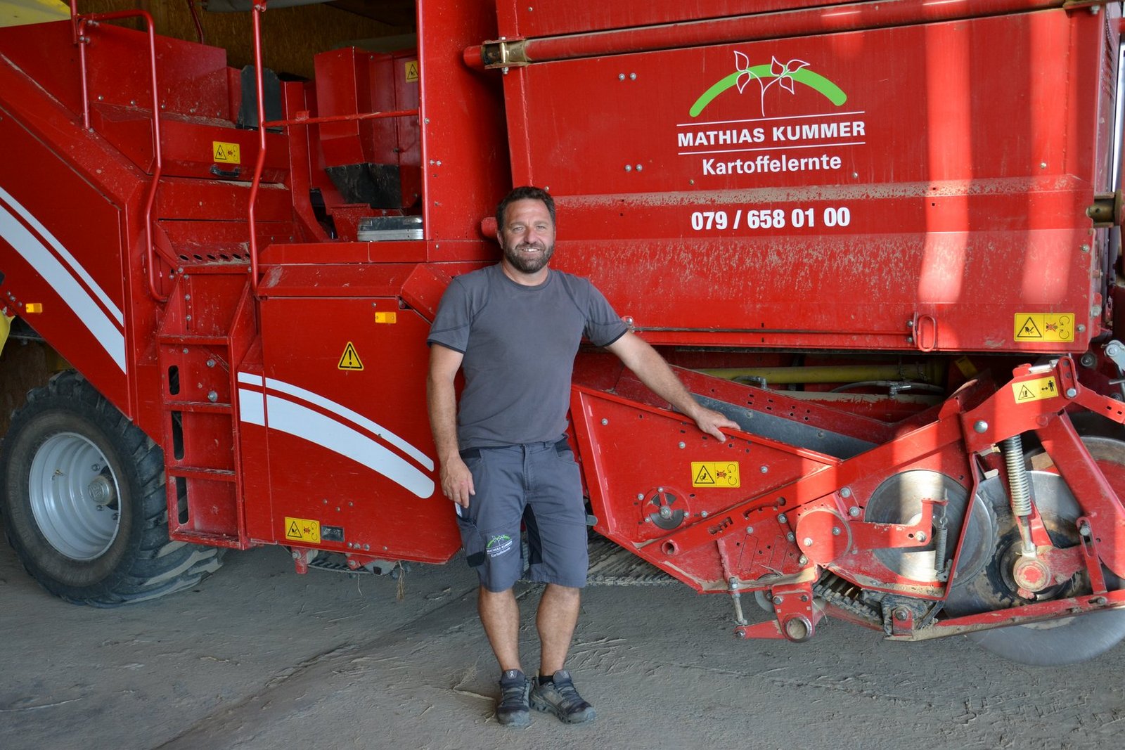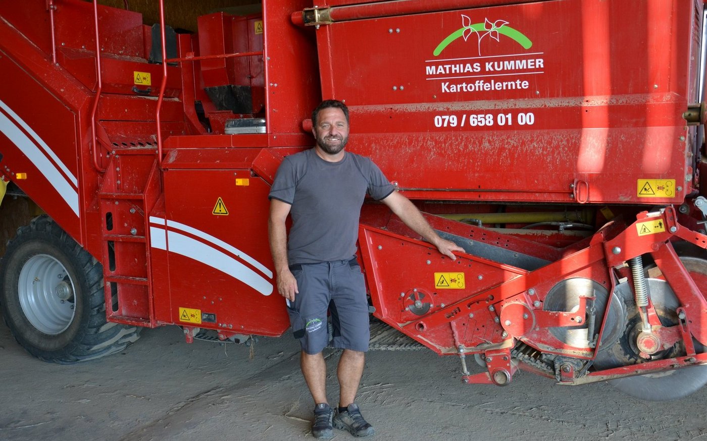 Am ersten September fängt die Einlagerung der schalenfesten Kartoffeln an. «Dann beginnt der Ansturm», sagt Mathias Kummer, der in Limpach BE einen eigenen Betrieb und ein Lohnunternehmen mit fünf bis sechs Teilzeitangestellten führt. Seine fünf Grimme-Roder (ein- und zweireihig) sind dann gefragt. Für ihn ist klar: Wenn die Kartoffeln reif sind, müssen sie möglichst bald aus der Erde. Sie werden ja nicht besser.