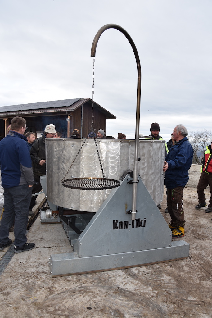 Rund 20 Leute haben sich auf einem zugigen Hügel über Zollbrück BE um eine grosse Feuerschale versammelt. Und obwohl an einem schwenkbaren Arm ein Grillrost hängt, unterscheidet sich der Vorgang in der Schale klar von einem Lagerfeuer: Im Kon-Tiki läuft eine Pyrolyse.