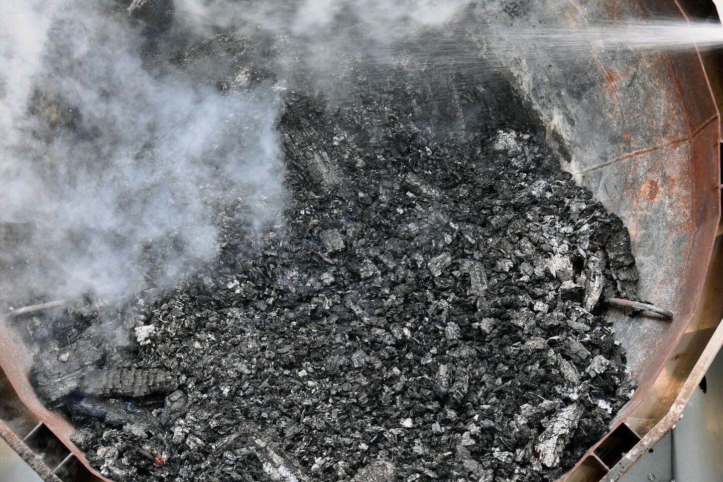 [IMG 6]Ein für die Qualität der Kohle wichtiger Schritt ist das abschliessende Löschen der Glut. Der Kon-Tiki hat dafür unterhalb der Schale ein Rohr, durch das Wasser eingeleitet werden kann. Die Glut wird von unten her geflutet. Der in der heissen Kohle aufsteigende Wasserdampf sorgt für ein langsames Ablöschen der oberen Holzschichten und treibt allfällige kondensierte Substanzen aus den Poren. Die Kohle wird quasi durchgeputzt, die Poren werden geöffnet und es resultiert ein Material mit einer riesigen Oberfläche von über 300 m2/g.