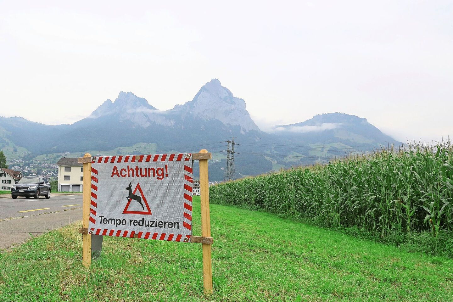 «Achtung, Tempo reduzieren», warnen derzeit Schilder im Schwyzer Talboden vor plötzlich auftauchenden Hirschen auf der Strasse neben Maisfeldern. Mit der Zunahme der Maisfelder zwischen Schwyz und Brunnen wachse auch die Anzahl Hirsche, die sich im Talboden aufhalten, berichtete kürzlich der «Bote der Urschweiz». In den Maisfeldern würden sich vorwiegend Hirschkühe mit ihren Kälbern aufhalten, wird der zuständige Wildhüter Pius Reichlin zitiert. Die Wildhut rate, Maisfelder künftig einzuzäunen, wenn die Maispflanzen rund einen Meter hoch sind.