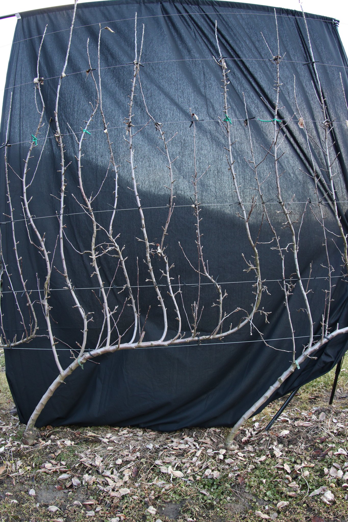 - Mehrachsige Bäume: Durch das Ablegen des Mitteltriebes entstehen auf der Oberseite Fruchtholzträger, die senkrecht und sehr schlank an einem Drahtgerüst geführt werden. Der Reihenabstand kann so verkleinert werden. Hingegen führen mehrachsige Bäume zu einem weiteren Pflanzabstand in der Reihe, was die Anzahl Bäume pro Hektare reduziert.