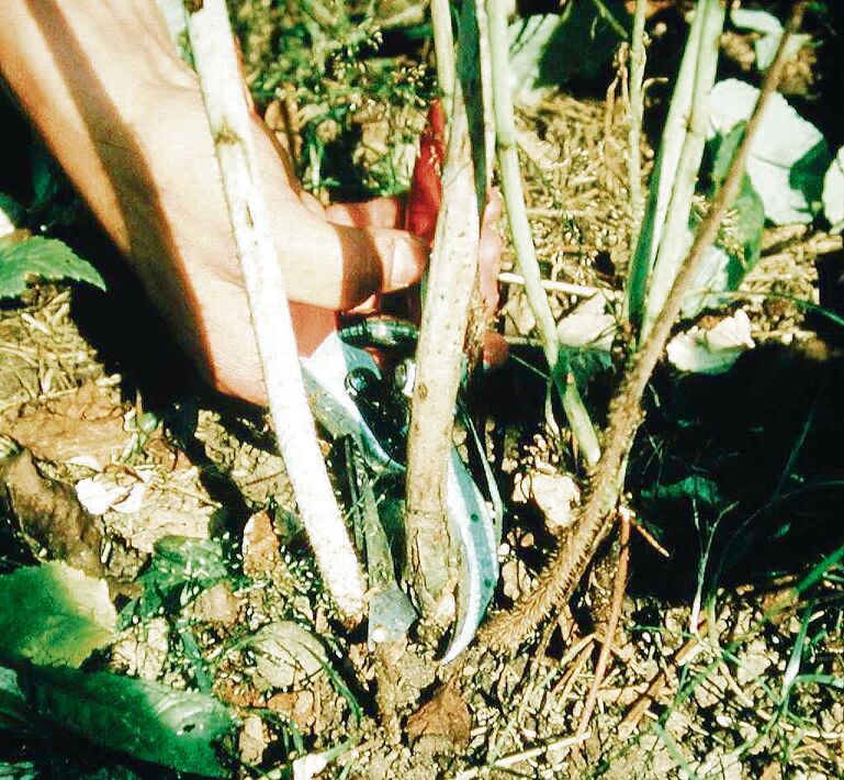 - Brombeeren: Parallel zur Brombeerenernte ist es nötig, die Jungruten auszudünnen. Dabei sind die zweitstärksten Ruten den stärksten vorziehen. Diese Ruten werden die gewünschte Länge ohne Weiteres erreichen, aber an der Rutenbasis deutlich weniger aufspringen. Nach und nach werden die Seitentriebe an den Jungruten auf eine Scherenlänge eingekürzt.