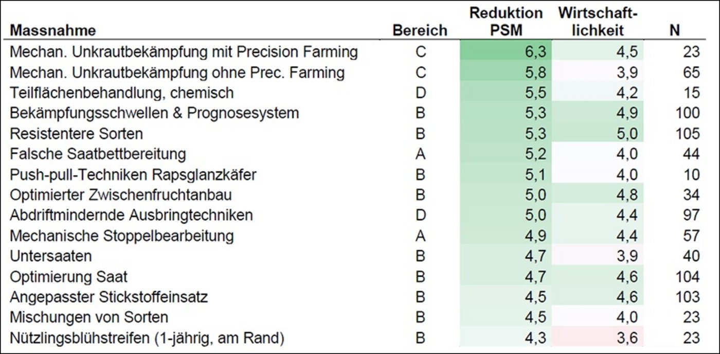Was die Wirkung zur PSM-Reduktion angeht, wurden die Massnahmen (siehe unten) laut einem Bericht von Agroscope in «Agrarforschung Schweiz» überwiegend als eher positiv bzw. positiv bewertet. Insbesondere nicht-chemische Bekämpfungsmethoden nahm man als effektiv wahr, um auf PSM zu verzichten. Die besten Noten gab es für mechanische Verfahren gegen Unkraut zur Einsparung von Herbiziden.