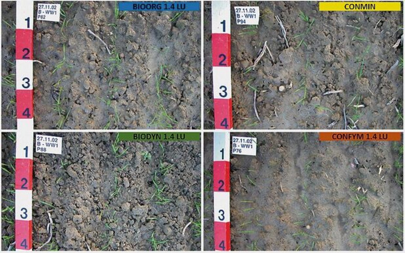 Seit 45 Jahren läuft am FiBL in Zusammenarbeit mit Agroscope der DOK-Versuch in Therwil BL, der verschiedene Anbausysteme in ihrer Wirkung auf den Boden untersucht. Die Behandlungen entsprechen den Vorgaben von Demeter, Bio Suisse und IP-Suisse, zusätzlich gibt es eine rein mineralisch gedüngte Kontrollfläche. Dabei sind Bodenbearbeitung und Fruchtfolge in allen Systemen gleich. Die Resultate zeigen unter anderem die Wichtigkeit von organischen Düngern für den Erhalt des Bodenkohlenstoffs. «Alle Verfahren, bei denen mit 0,7 DGVE pro Jahr und Hektare oder ausschliesslich mit Mineraldünger gearbeitet wurde, haben Kohlenstoff verloren», so Else Bünemann vom FiBL. Stabil blieben die Werte hingegen bei 1,4 DGVE.