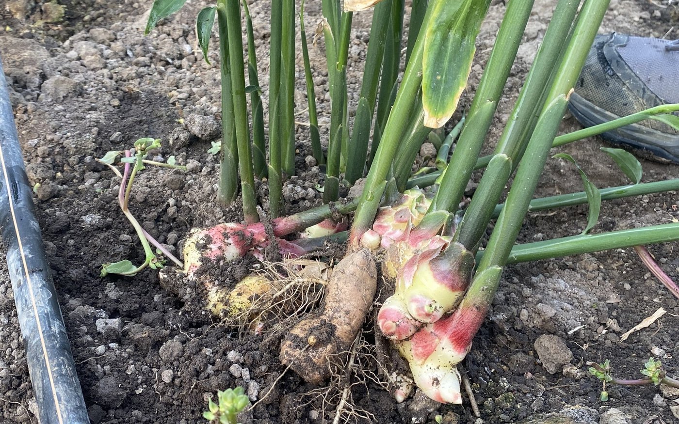 Die Rhizome kaufen sie auf dem Engrosmarkt in Zürich. Keine Ware aus China, sondern aus Peru, das sei der Grundsatz. In die chinesische Ware haben sie wenig Vertrauen. Die Wärme liebenden Ingwerwurzeln werden Ende April im Abstand von 50 cm in Reihen in die Erde gesteckt. Die Temperatur und Feuchtigkeit sind die entscheidenden Faktoren, wie lange es geht, bis die Pflanzen keimen.