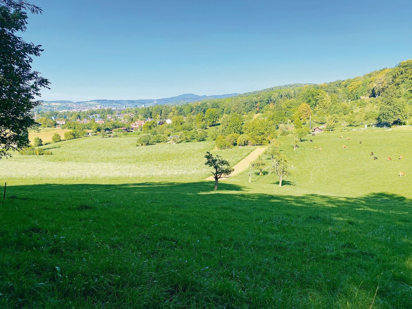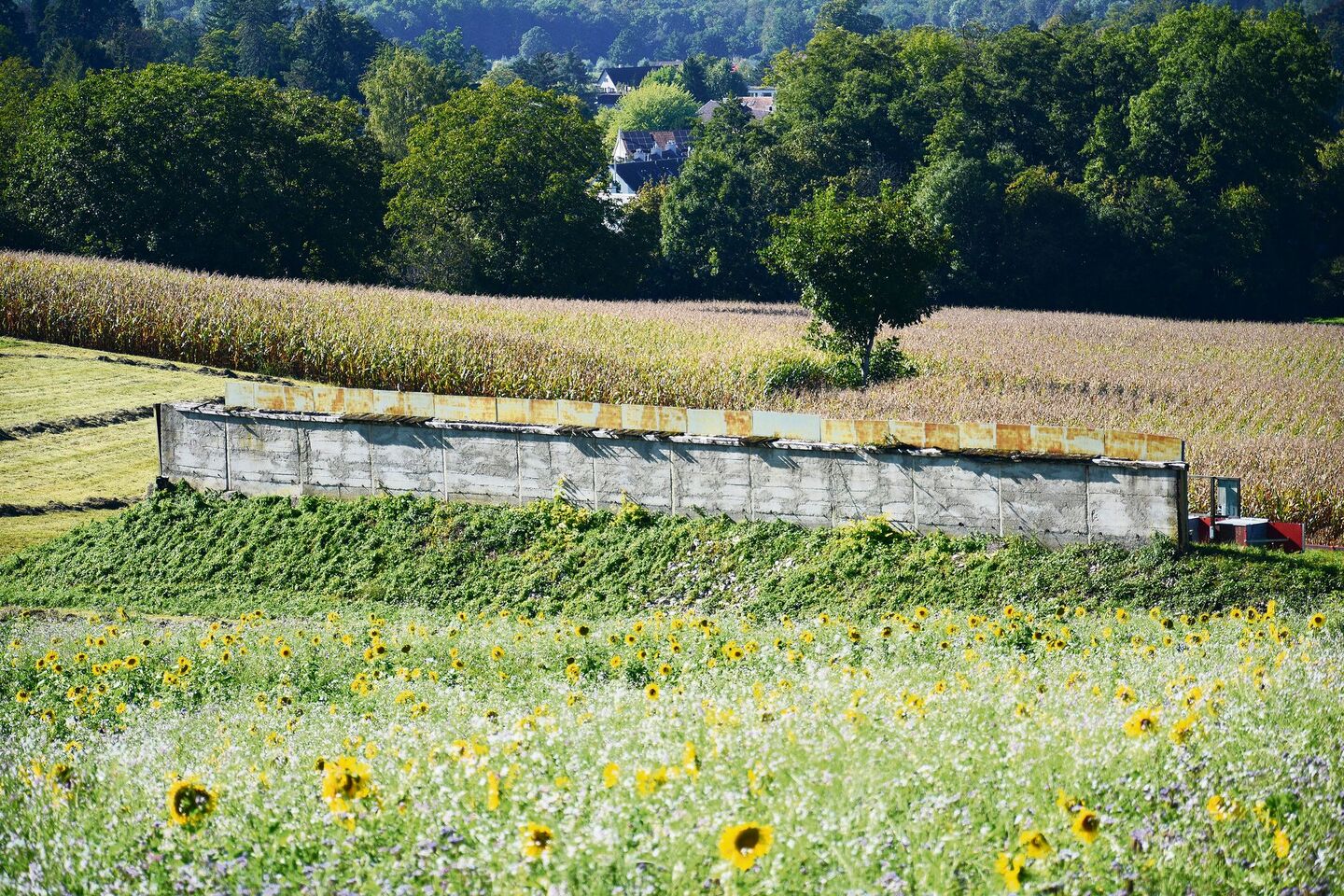 Unterhalb des Ackersaums, der im Frühling gesät wird, schützt eine herbstliche Gründüngung den Boden. Vor dem als Streifenfrässaat gesäten Körnermais bildet der Kugelfang eines Schiessstands mit seinem Hügel bereits eine Barriere, die verlängert und in eine Versickerungsmulde überführt werden könnte. Links davon besteht heute eine trichterförmige Vertiefung, durch die das Wasser bei Starkregen Richtung Siedlung schiesst.