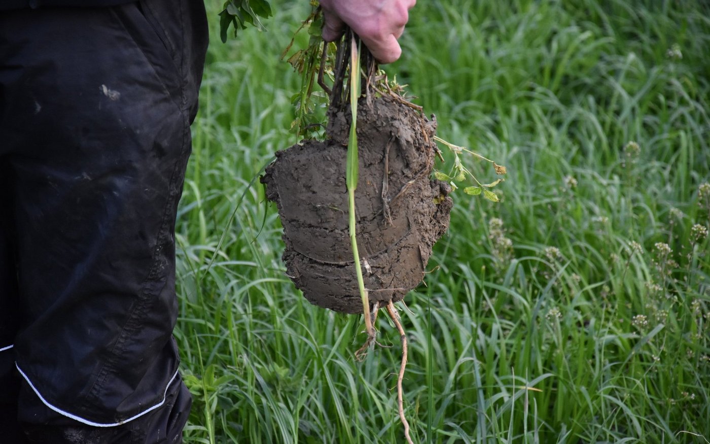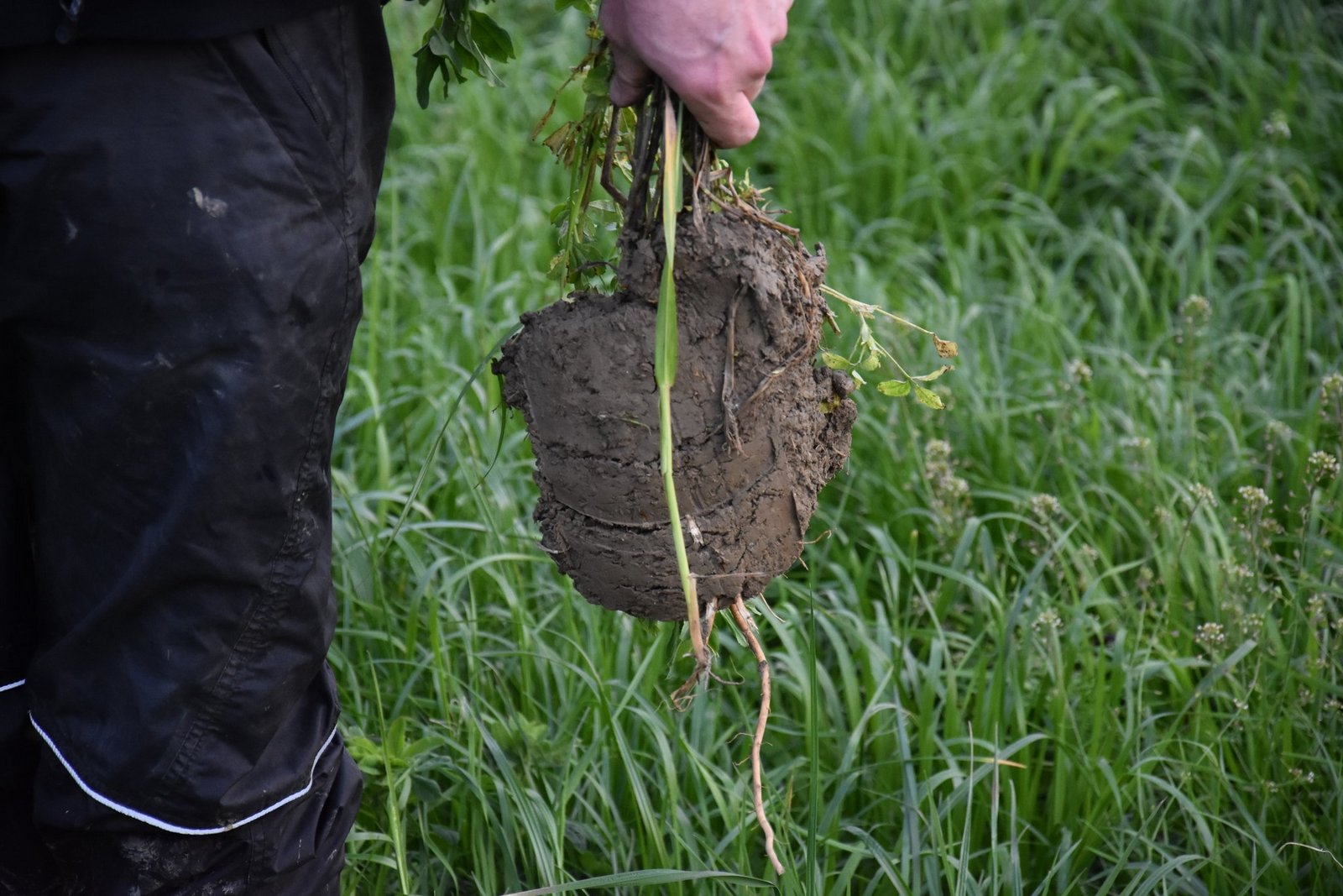 Etwas weiter hangabwärts zeigte Samuel Tschumi eine UFA-Regina-Gold-Mischung mit 50 Prozent Luzerneanteil im dritten Standjahr. «Die gemeine Rispe kommt durch», stellte er fest. Es mache sicher Sinn, hier noch den ersten Schnitt zu nutzen und dann Mais zu säen. «Es muss einen ein bisschen reuen», meinte er, doch nach dem ersten Schnitt sei hier wahrscheinlich die Luft raus. «Beim dritten Schnitt hatten wir im letzten Jahr nur noch Luzerne», erinnerte sich einer der anwesenden Landwirte. Der Berater bestätigte, dass die trockentolerante Leguminose mit ihrer langen Pfahlwurzel in der Mischung wie eine Versicherung wirke. Am besten lasse man die Luzerne in punkto Schnittregime einmal im Jahr aufblühen.