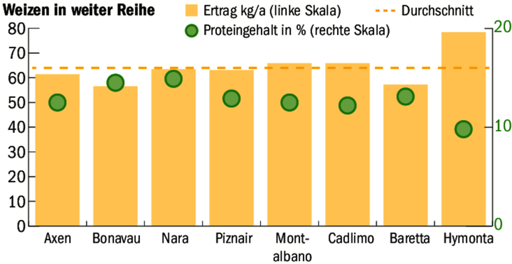 [IMG 6] Die Herbizid- und Blattdüngungsstrategie basierte bei Weizen auf die gleichen Produkte wie beim Dinkel. Die Weizensorten kompensierten optisch sehr unterschiedlich. Nara beispielsweise bestockte sehr schlecht, hingegen Montalbano oder die Hybridsorte Hymonta erwiesen sich als bestockungsfreudig. Im Ertrag differenzieren die Sorten hingegen weniger stark. Der Durchschnittsertrag über alle Weizensorten betrug rund 64 dt/ha. Ertragsmässig erreichte Nara rund 63 dt/ha mit einem Proteingehalt von 14,5 %. Einen Spitzenertrag brachte der Hybridweizen Hymonta mit 78 dt/ha. In der EU ist Hymonta eine Brotweizensorte, in der Schweiz hingegen gilt er aufgrund des tiefen Proteingehalts als Futterweizen. Insgesamt betrug der Ertragsverlust zwischen 10 bis 15 %.