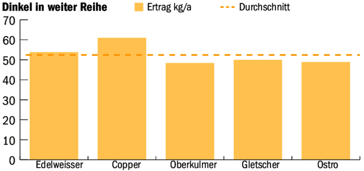 Der Ertragsverlust durch die Aussaat in weiten Reihen betrug zwischen 5 und 10 %. Bei den Erträgen schwang die Sorte Copper obenauf. Abgeschlagen auf den hinteren Plätzen sind die Urdinkelsorten Oberkulmer und Ostro zu finden.