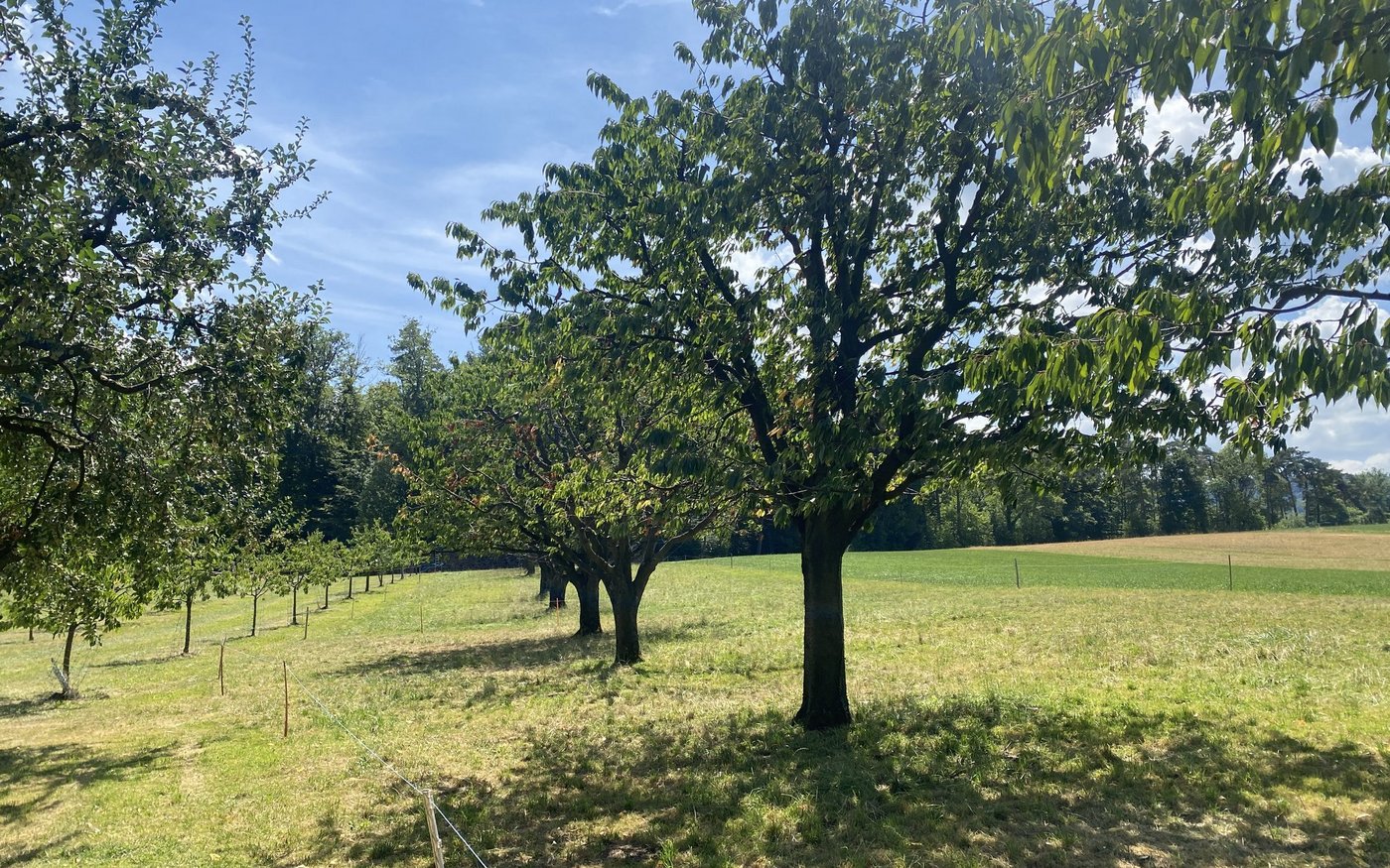 Die 30 Milchkühe des Prinzenhofs stellen Haupteinnahmequelle der Schwobs dar. Seit 2018 sind sie in einem neuen Stall untergebracht, der in Zusammenarbeit mit meinem Kuhsignal-Berater gebaut wurde und daher besonders hohes Tierwohl verspricht. Zwar ist der Betrieb mit Ackerbau, Mirabellen, Äpfeln, Kirschen, Milchwirtschaft, Aufzucht- und Mastkälbern sehr divers aufgestellt. «Aber wir spüren den Druck zur Spezialisierung», meint Peter Schwob. So bestehe für die Hochstammkirschen heute keine Nachfrage mehr, gesucht seien grössere Kaliber. Daher ernten Schwobs Kirschen nur noch für den Eigenbedarf und werden die alten Bäume nicht mehr ersetzen. «Für meine Eltern waren sie noch sehr einkommensrelevant. Für sie ist es schwierig, dass Hochstamm-Kirschen heute kaum mehr etwas wert sind».