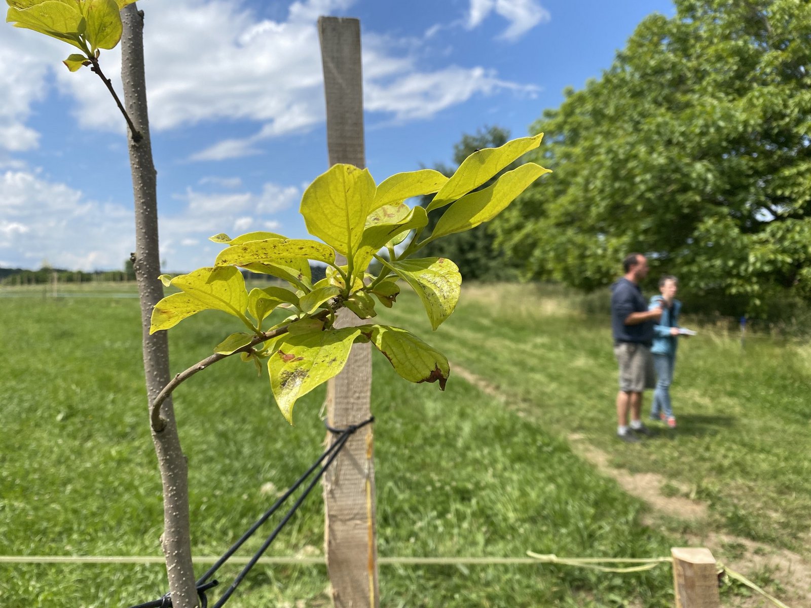 Die Pflanzung des Agroforsts erfolgte in Wallenbuch ausschliesslich von Hand. Dank dem Netzwerk der Solawi waren rund 50 freiwillige Helferinnen und Helfer beteiligt. Insgesamt sei es – die Arbeitszeit eingerechnet – eine Investition von rund 30'000 Franken gewesen, meint Valentin Birbaum. 25'000 konnte er über Beiträge finanzieren, sei es von Kanton und Gemeinde oder der Stiftungen Visio Permacultura und myclimate. Unterstützung gab es auch vom Fonds Landschaft Schweiz (FLS), der seinen «Fokus Agroforst 2022-23» auf dem Betrieb der Birbaums vor den Medien lancierte.