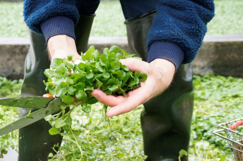 Die Ernte ist Handarbeit: die Brunnenkresse wird mit der Rasenschere oder der Sense abgeschnitten.