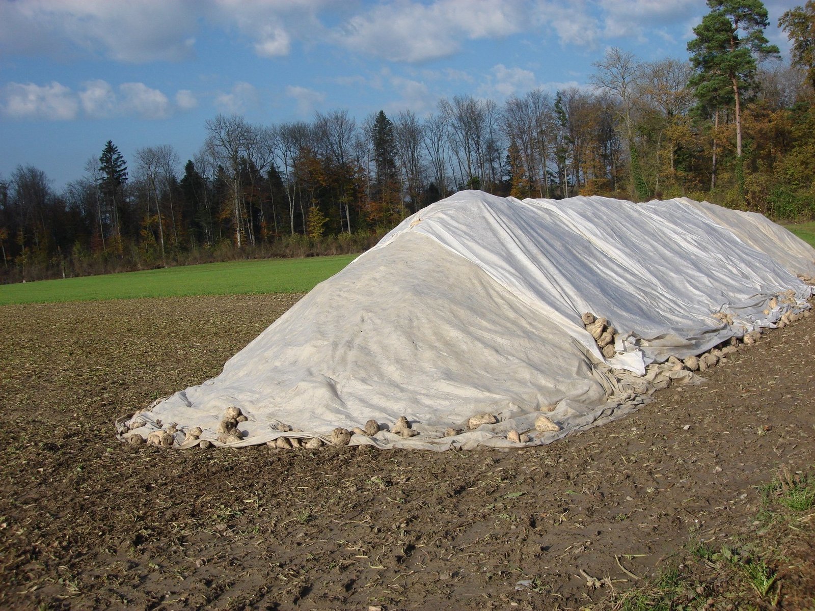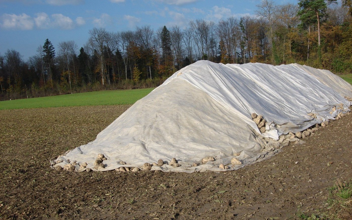 Wurden die Rüben bereits auf Vorrat geerntet und an die Miete gelegt, so sollten diese mit einem Vlies abgedeckt werden, um die Zuckergehaltseinbussen möglichst gering zu halten. Ein korrekt über den Haufen gezogenes Vlies bietet Schutz vor Regen, da das herabfallende Wasser nach aussen ablaufen kann. Zudem bleibt die Temperatur in abgedeckten Rübenmieten konstanter, wodurch das Vlies als Frostschutz dient. Um die Wahrscheinlichkeit von Fäulnis in den Rübenmieten zu verringern, muss die Rodung sorgfältig vonstattengehen. Die Rüben sollten lediglich so tief geköpft werden, dass ein «Fünfliber» auf die Schnittfläche passt. Des Weiteren sollten die Zuckerrüben möglichst verletzungsfrei auf die Miete gelegt werden.