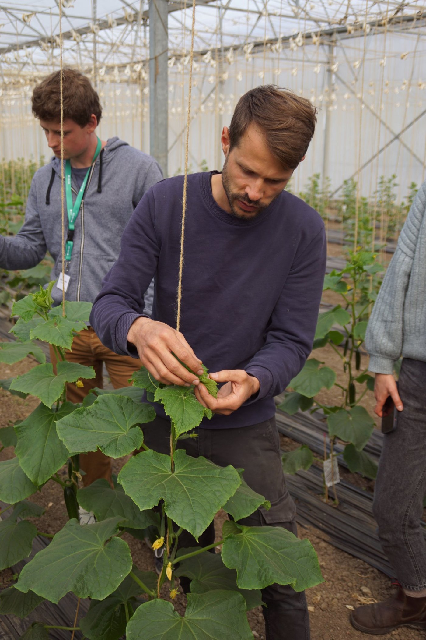 Im nächsten Gewächshaus wachsen Gurken. Auch hier versucht der Landwirt so gut wie möglich, ohne die im Biolandbau zugelassenen Spritzmittel gegen Pilzkrankheiten auszukommen. Gegen Blattläuse setzt er Nützlinge wie Schlupfwespen oder Raubmilben ein. «Ein paar Blattläuse machen nichts», aber sie dürfen nicht überhandnehmen. Das Gleichgewicht sei entscheidend.
