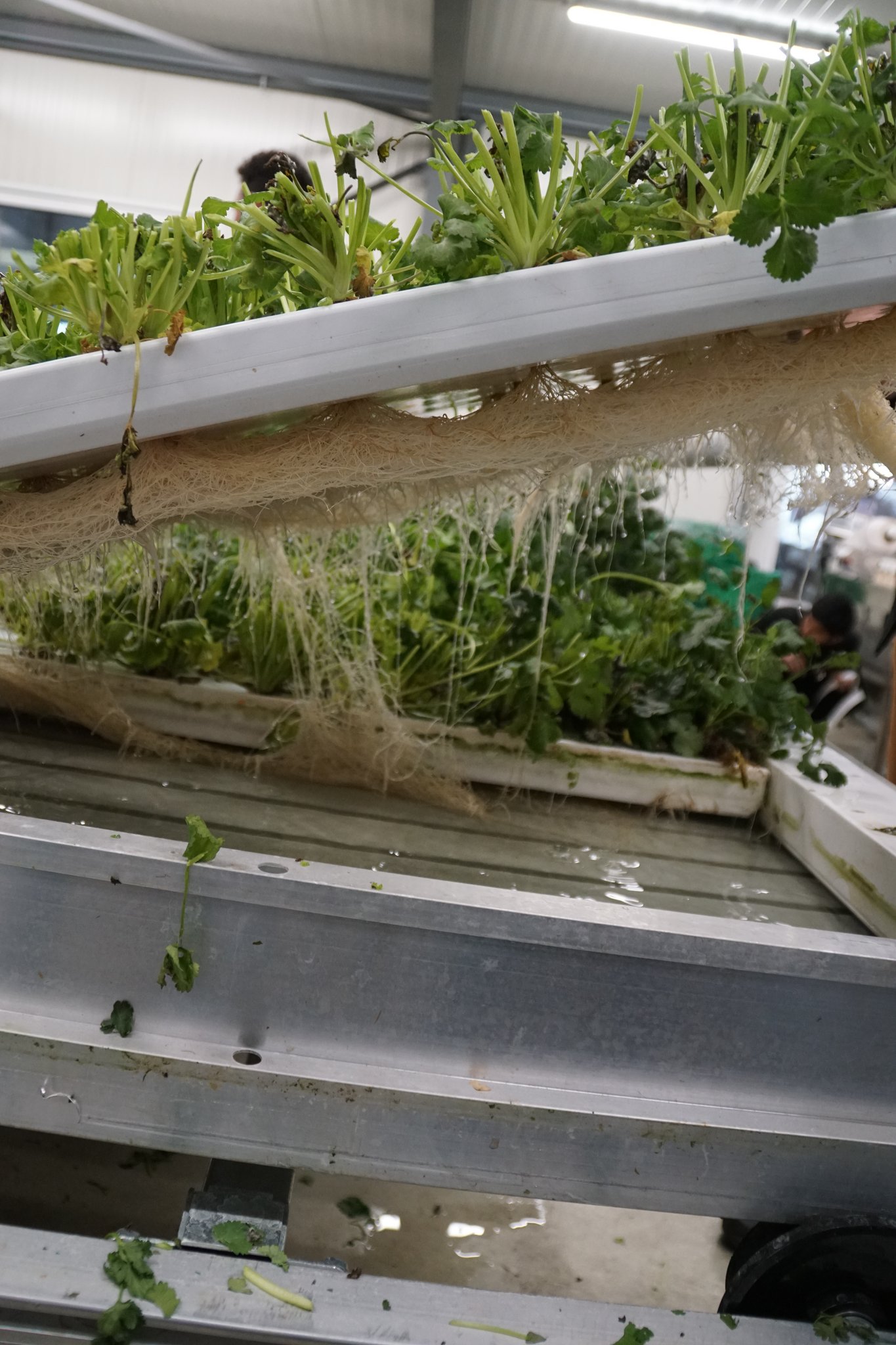 Aufzüge fahren die Tische nach oben und unten, je nachdem, ob die Pflanzen gesät werden, wachsen oder ob sie erntereif sind. «Die Pflanzen kommen zu den Leuten», erklärt Philipp Bosshard. Sie wachsen in einem hydroponischen Gewächshaus, das heisst, in mit Nährstoffen angereichertem Wasser. Dazu werden sie in kleinen Schaumstofftöpfchen ohne Erde ausgesät und aufgezogen. Das geschlossene Gebäude soll die Pflanzen nicht nur vor schlechtem Wetter, sondern auch vor Schädlingen schützen. Besucher müssen deswegen Überkleider anziehen. Wärme, Licht und Wasser sind genau geregelt. LED-Lampen ersetzen das Tageslicht. Die Nährlösung wird rezykliert, so dass nur so viel Frischwasser gebraucht wird, wie die Pflanzen aufnehmen. [IMG 3]