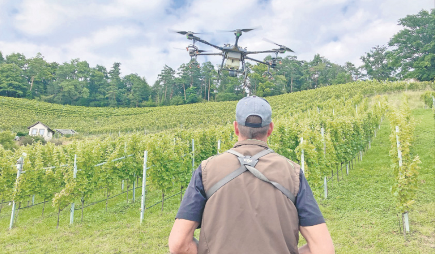 Stefan Hodler von der Firma Remote Vision demonstrierte am Fach- und Praxistag Rebbau einen Drohneneinsatz in einem Rebberg in Steillage. Dazu verwendete er eine Drohne des Typs Agras T16, die mit einem 16-Liter-Tank ausgerüstet ist. Zur Vorbereitung stellte Hodler wichtige Parameter wie beispielsweise Eckpunkte ein. Mit einer Geschwindigkeit von 4,5 km/h und einer Distanz von 4,3 m über dem Boden flog die Drohne schliesslich über die ausgewählte Parzelle im Wülflinger Rebberg und versprühte dabei das getankte Pflanzenschutzmittel. «Den Hang hinauf und hinunter fliegen geht nicht, das wäre zu ruckartig», sagte Hodler, der als Lohnunternehmer Sprühaufträge ausführt. «Stattdessen fliegt die Drohne quer über die Parzelle. So gibt es mehr Fluss und die Vernetzung ist besser». «Grundsätzlich ist die Applikation vom Boden aus wirksamer. In Steillagen jedoch bietet der Drohneneinsatz auch viele Vorteile», so Michael Gölles vom Strickhof. Vorzüge der Applikation aus der Luft seien etwa Bodenunabhängigkeit, das Vermeiden von Fahrspuren und mehr Arbeitssicherheit beim Ausbringen des Mittels.
