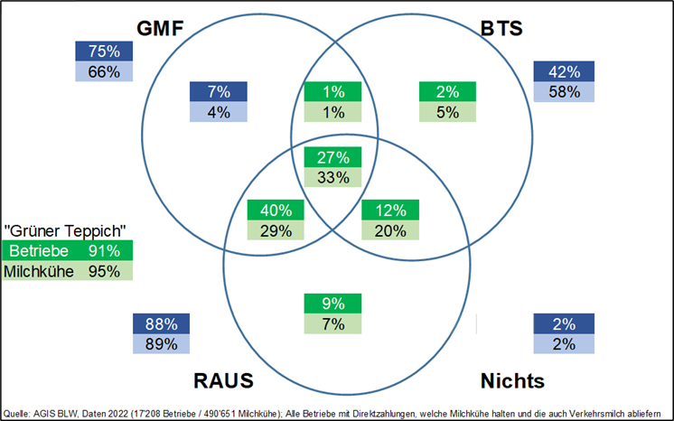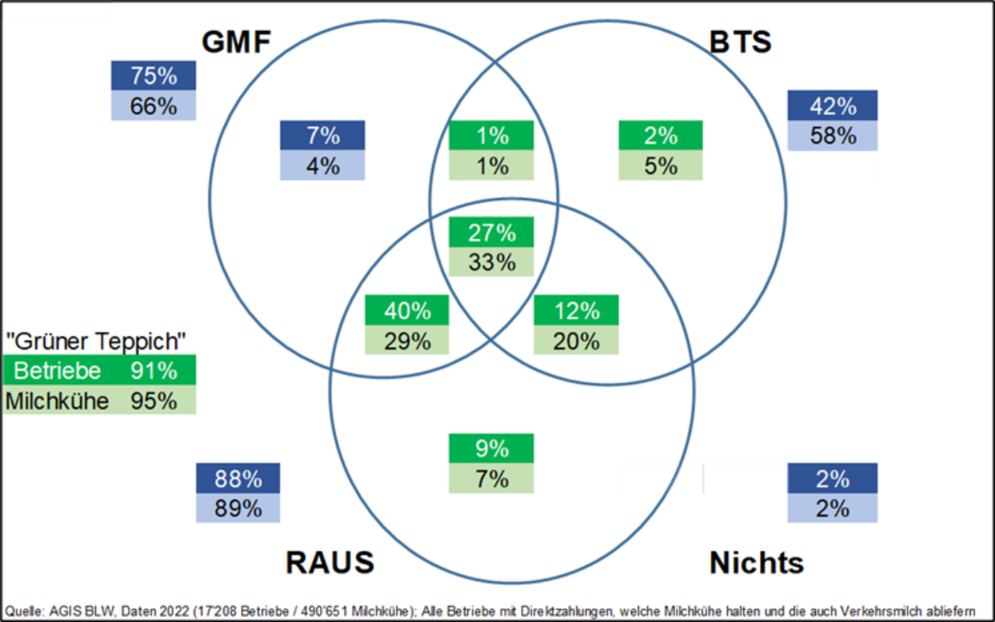 Seit der Einführung 2019 konnte eine Gesamtmenge von 70 Prozent der Inlandmilch erreicht werden, die den Vorgaben des Grünen Teppichs genügt. Damit profitieren 95 der Schweizer Milchkühe von RAUS bzw. BTS. Es gibt aber markante Unterschiede: Während 90 Prozent der Molkereimilchbetriebe angemeldet sind, liegt die Quote bei der Käsereimilch bei nur 33 Prozent.